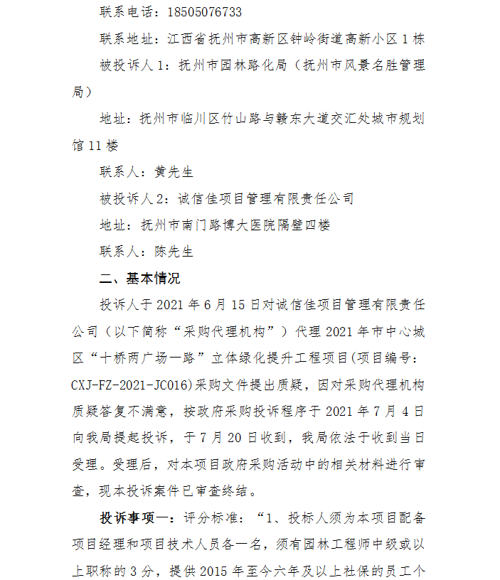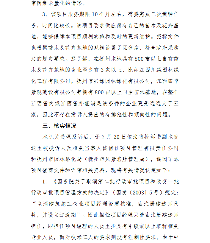 抚州市财政局关于2021年市中心城区“十桥两广场一路”立体绿化提升工程的 投诉处理决定