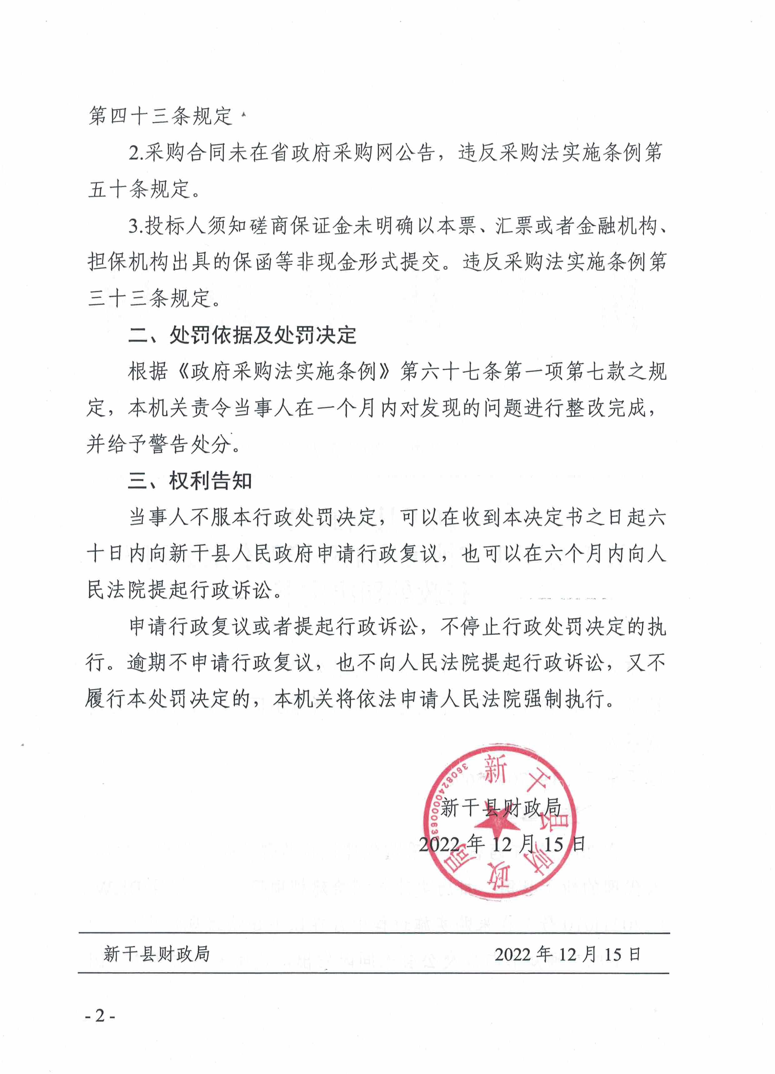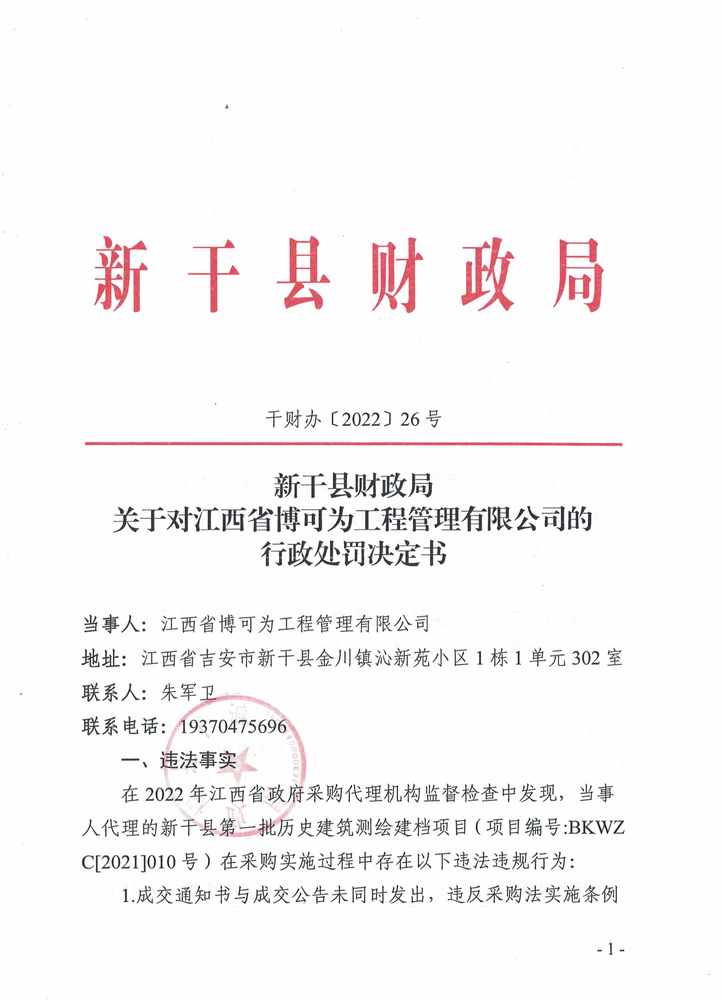 新干县财政局关于对江西省博可为工程管理有限公司的行政处罚决定书