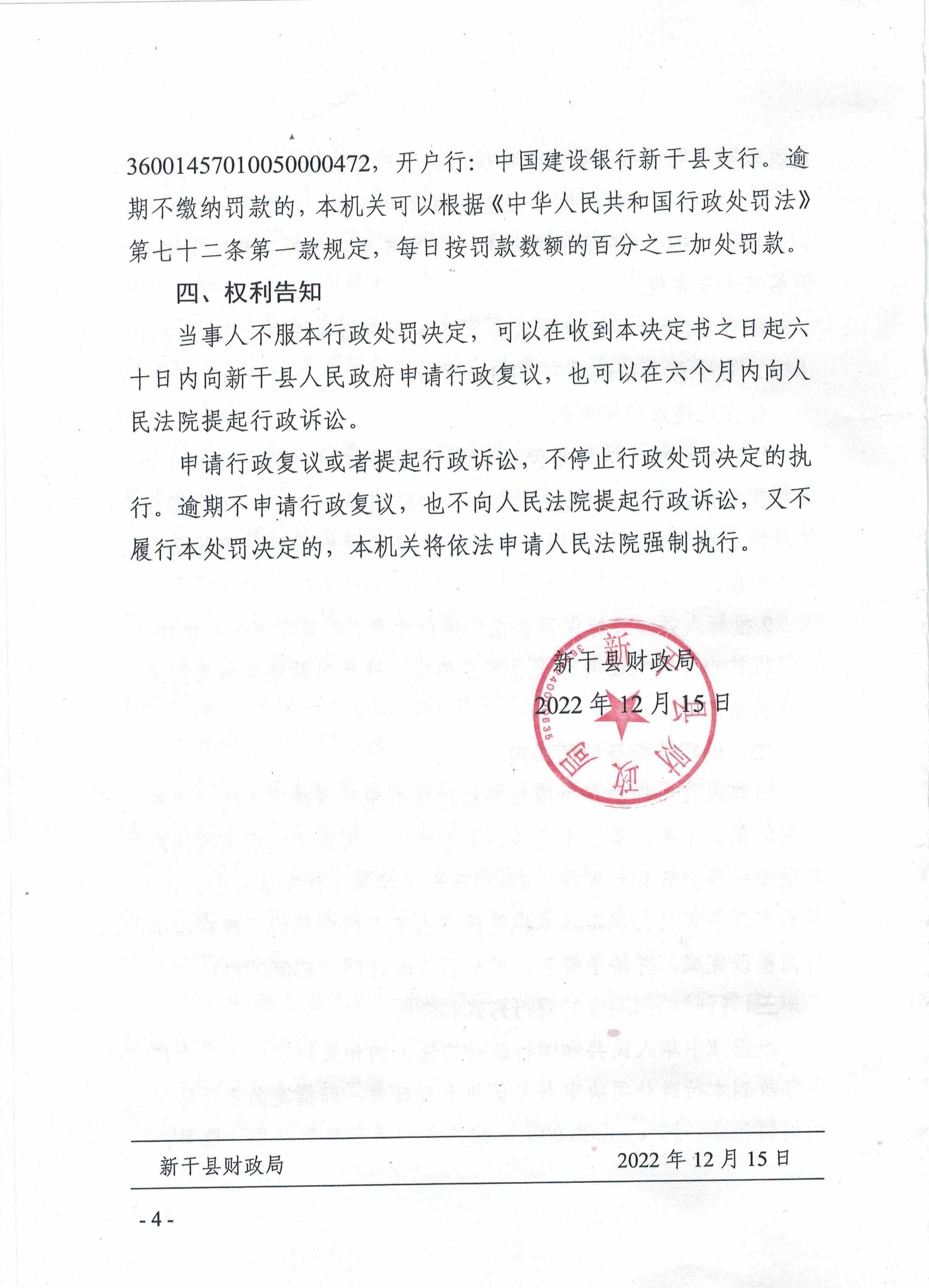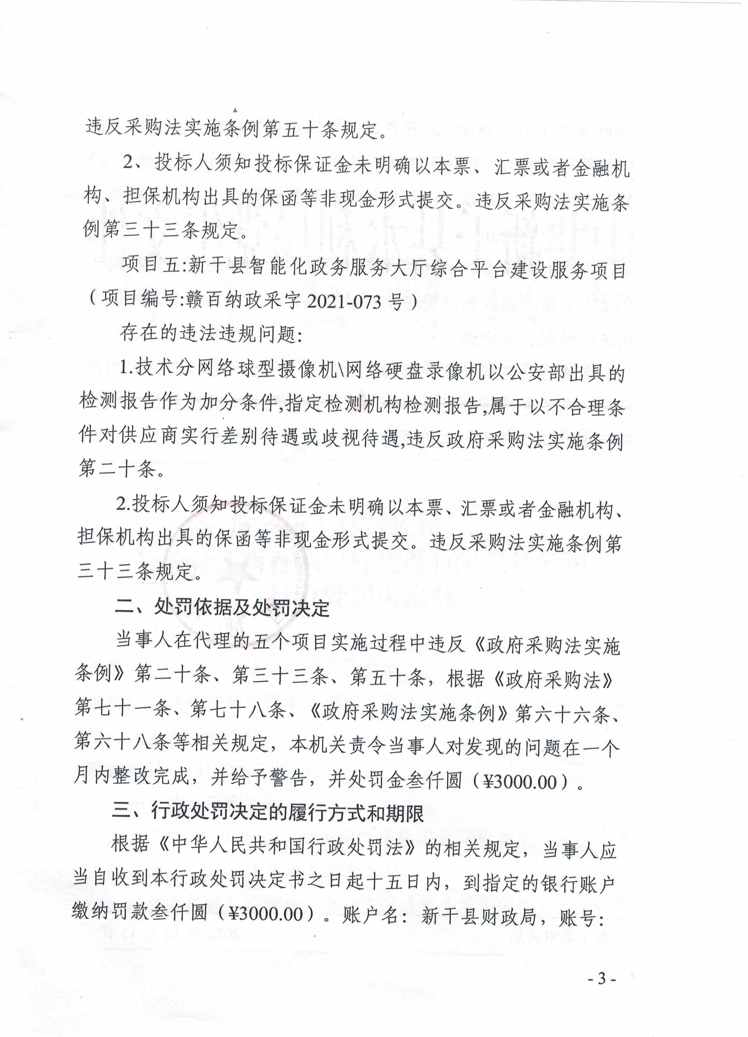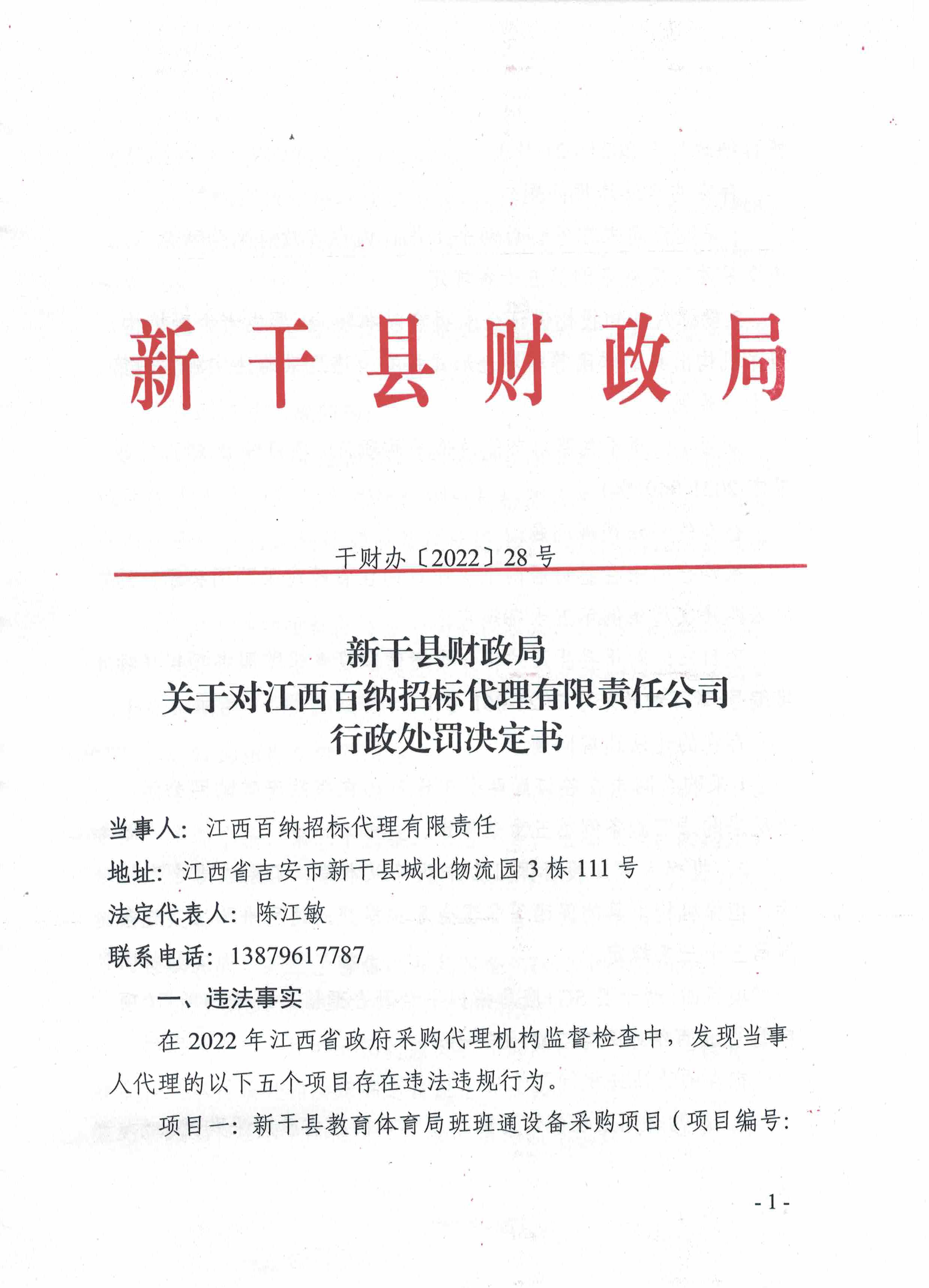 新干县财政局关于对江西百纳招标代理有限责任公司的行政处罚决定书