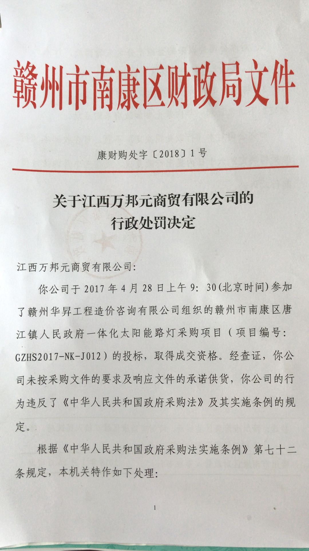 你公司于2017年4月28日上午9:30(北京时间)参加了赣州华昇工程造价咨询有限公司组织的赣州市南康区唐江镇人民政府一体化太阳能路灯采购项目(项目编号:GZHS2017-NK-J012)的投标,取得成交资格。经查证,你公司未按采购文件的要求及响应文件的承诺供货,你公司的行为违反了《中华人民共和国政府采购法》及其实施条例的规定。
