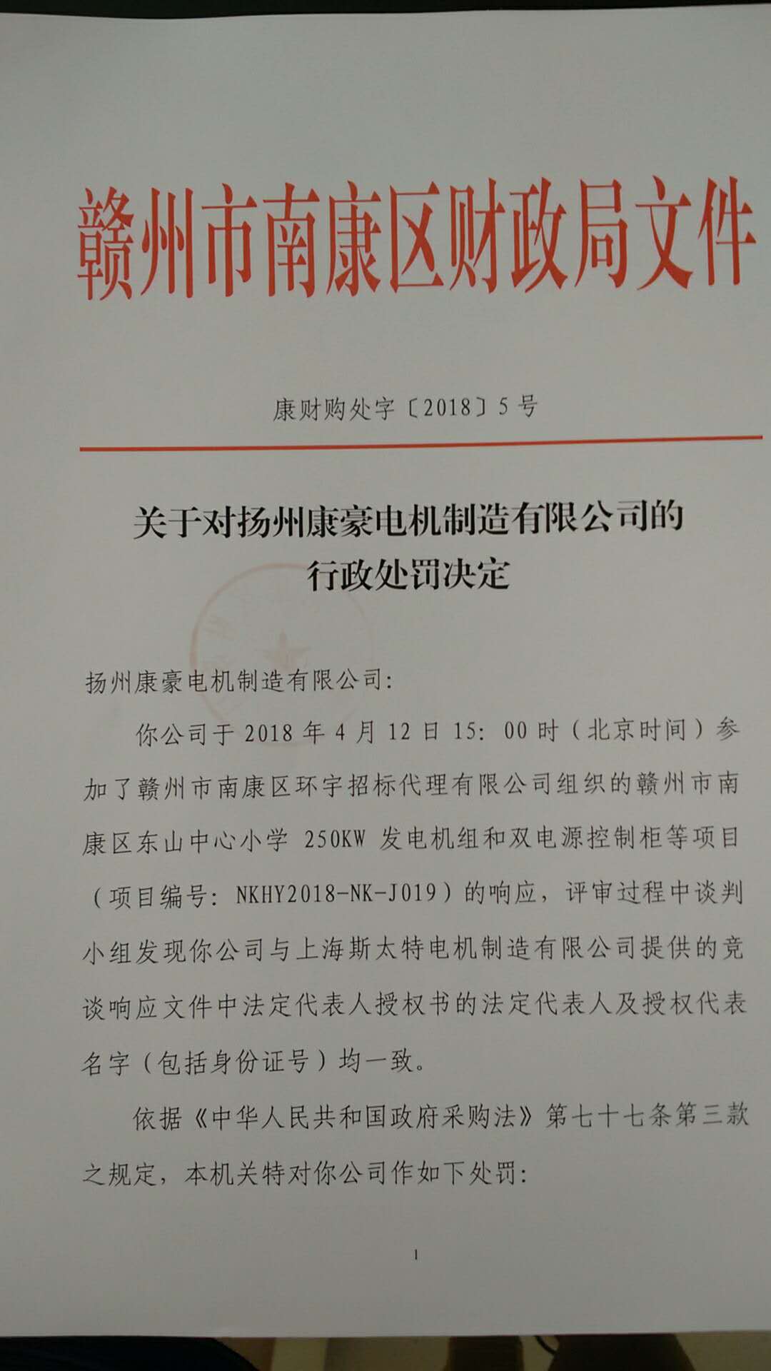 你公司于2018年4月12日15:00时(北京时间)参加了赣州市南康区环宇招标代理有限公司组织的赣州市南康区东山中心小学250KW发电机组和双电源控制柜等项目(项目编号:NKHY2018-NK-J019)的响应,评审过程中谈判小组发现你公司与上海斯太特电机制造有限公司提供的竞谈响应文件中法定代表人授权书的法定代表人及授权代表名字(包括身份证号)均一致。