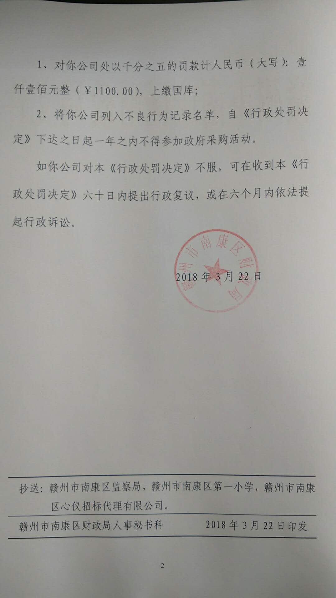 1、对你公司处以千分之五的罚款计人民币(大写):壹仟壹佰元整(¥1100.00),上缴国库;