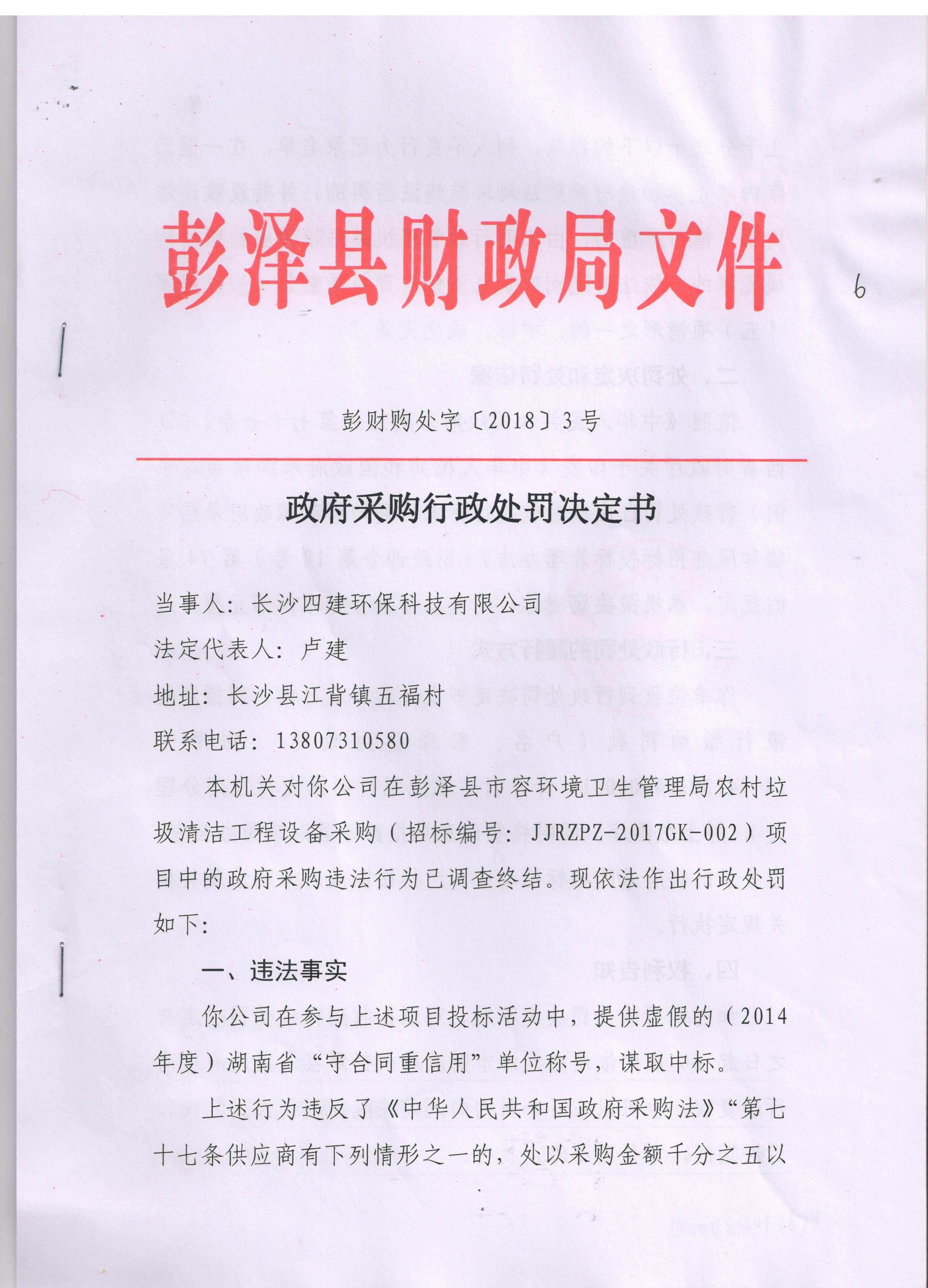 本机关对你公司在彭泽县市容环境卫生管理局农村垃圾清洁工程设备采购(招标编号:JJRZPZ-2017GK-002)项目中的政府采购违法行为已调查终结。现依法作出行政处罚如下: