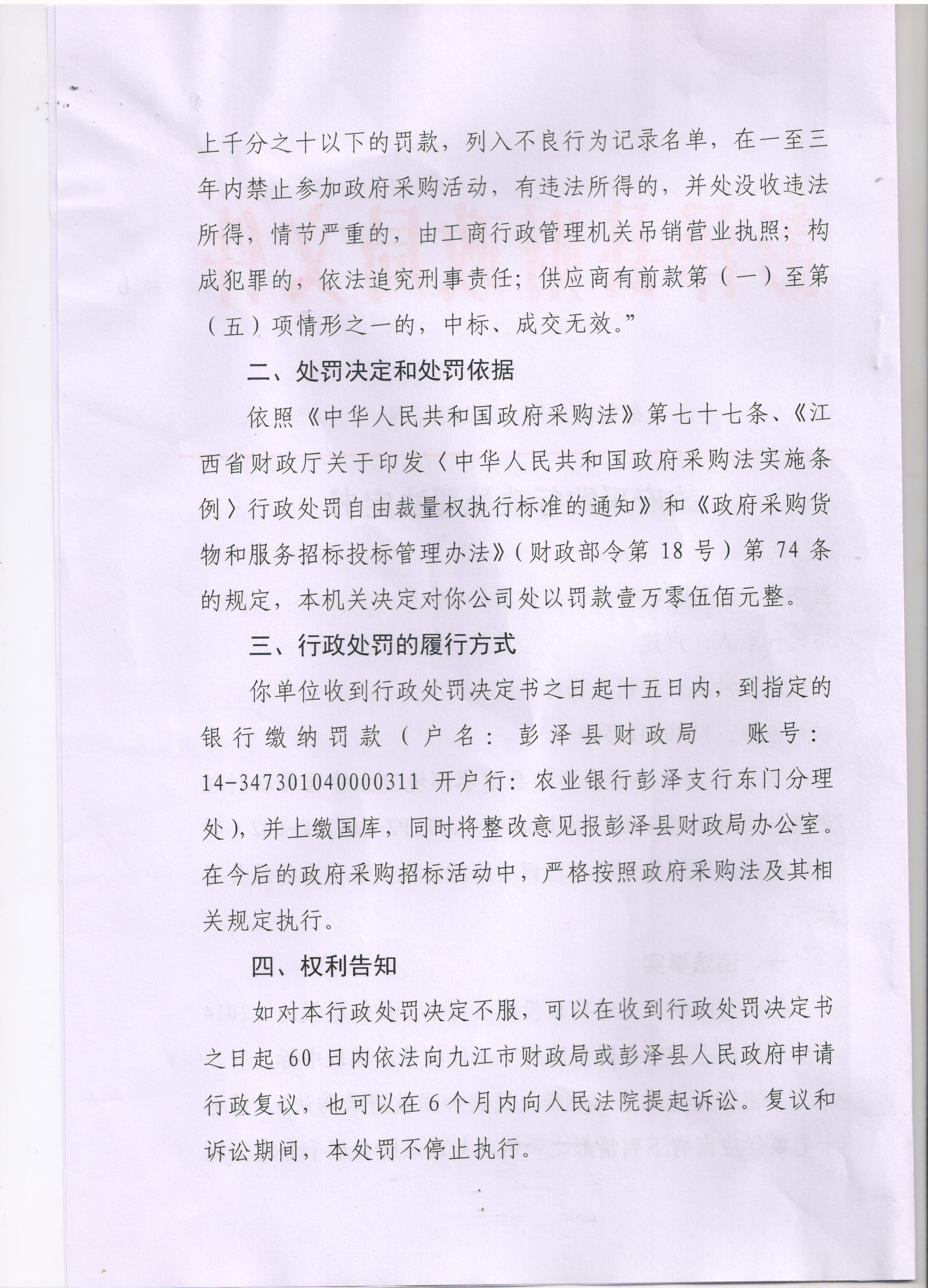 你单位收到行政处罚决定书之日起十五日内,到指定的银行缴纳罚款(户名:彭泽县财政局 账号:14-347301040000311开户行:农业银行彭泽支行东门分理处),并上缴国库,同时将整改意见报彭泽县财政局办公室。在今后的政府采购招标活动中,严格按照政府采购法及其相关规定执行。