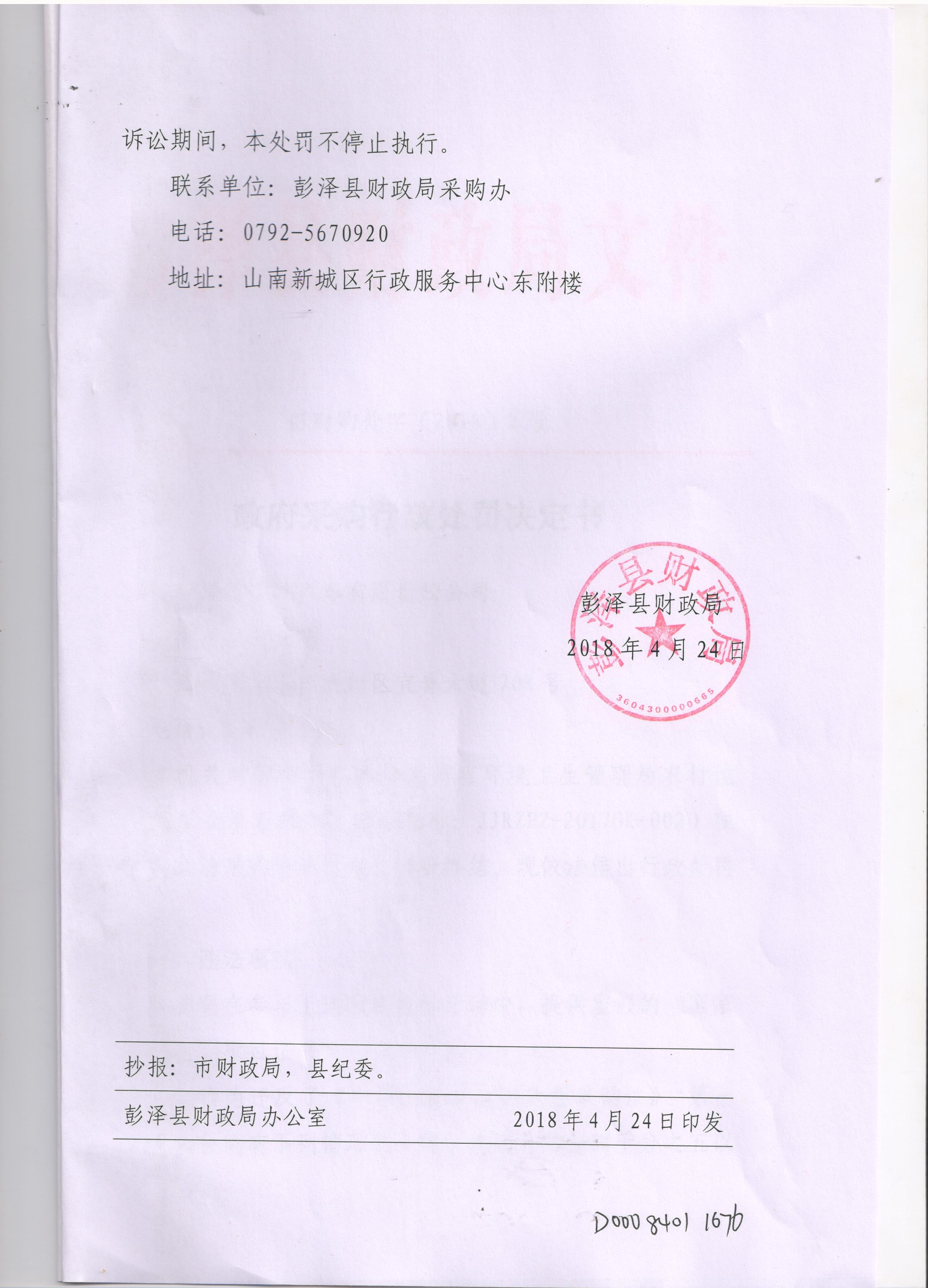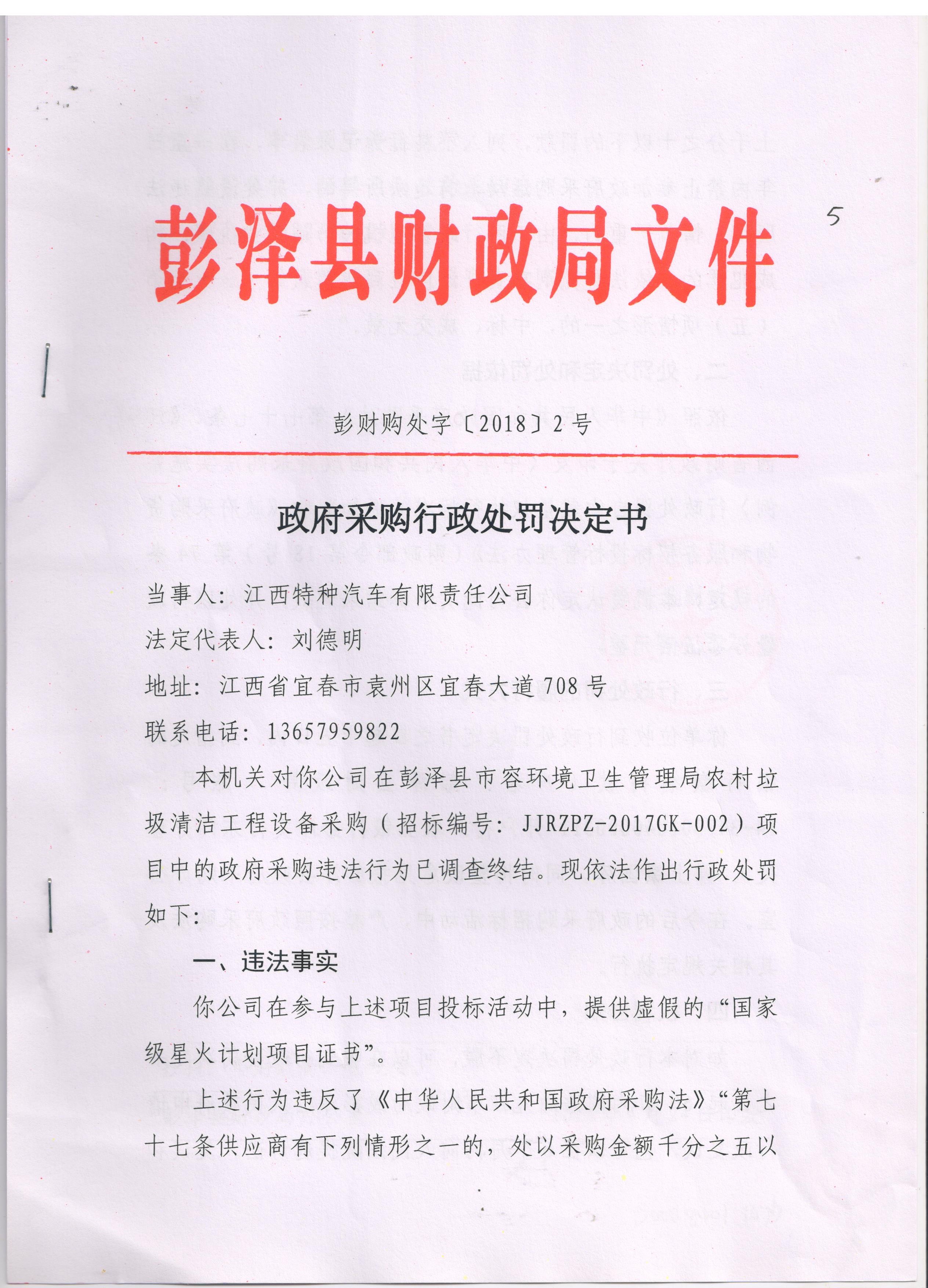 本机关对你公司在彭泽县市容环境卫生管理局农村垃圾清洁工程设备采购(招标编号:JJRZPZ-2017GK-002)项目中的政府采购违法行为已调查终结。现依法作出行政处罚如下: