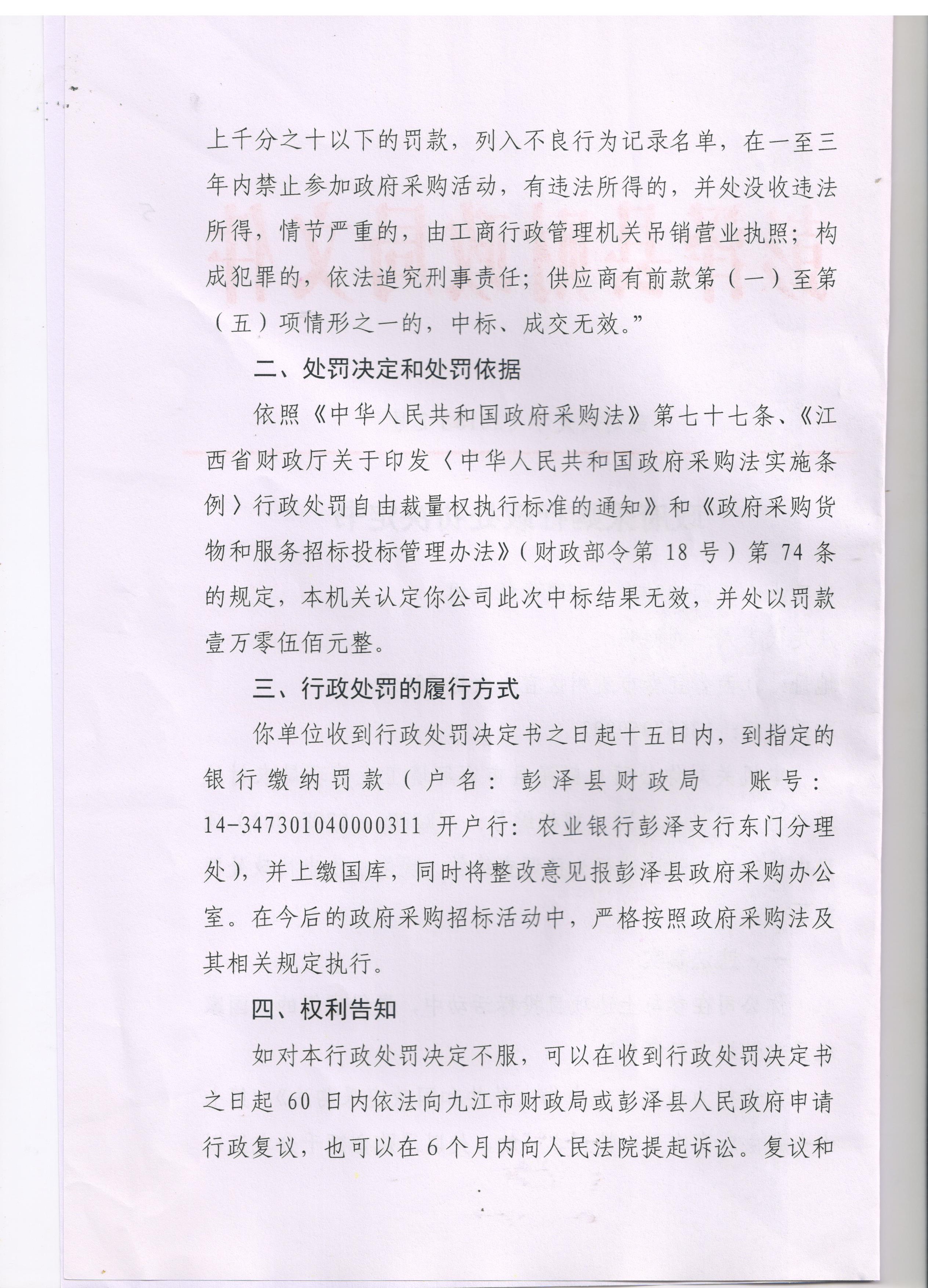 你单位收到行政处罚决定书之日起十五日内,到指定的银行缴纳罚款(户名:彭泽县财政局 账号:14-347301040000311开户行:农业银行彭泽支行东门分理处),并上缴国库,同时将整改意见报彭泽县政府采购办公室。在今后的政府采购招标活动中,严格按照政府采购法及其相关规定执行。
