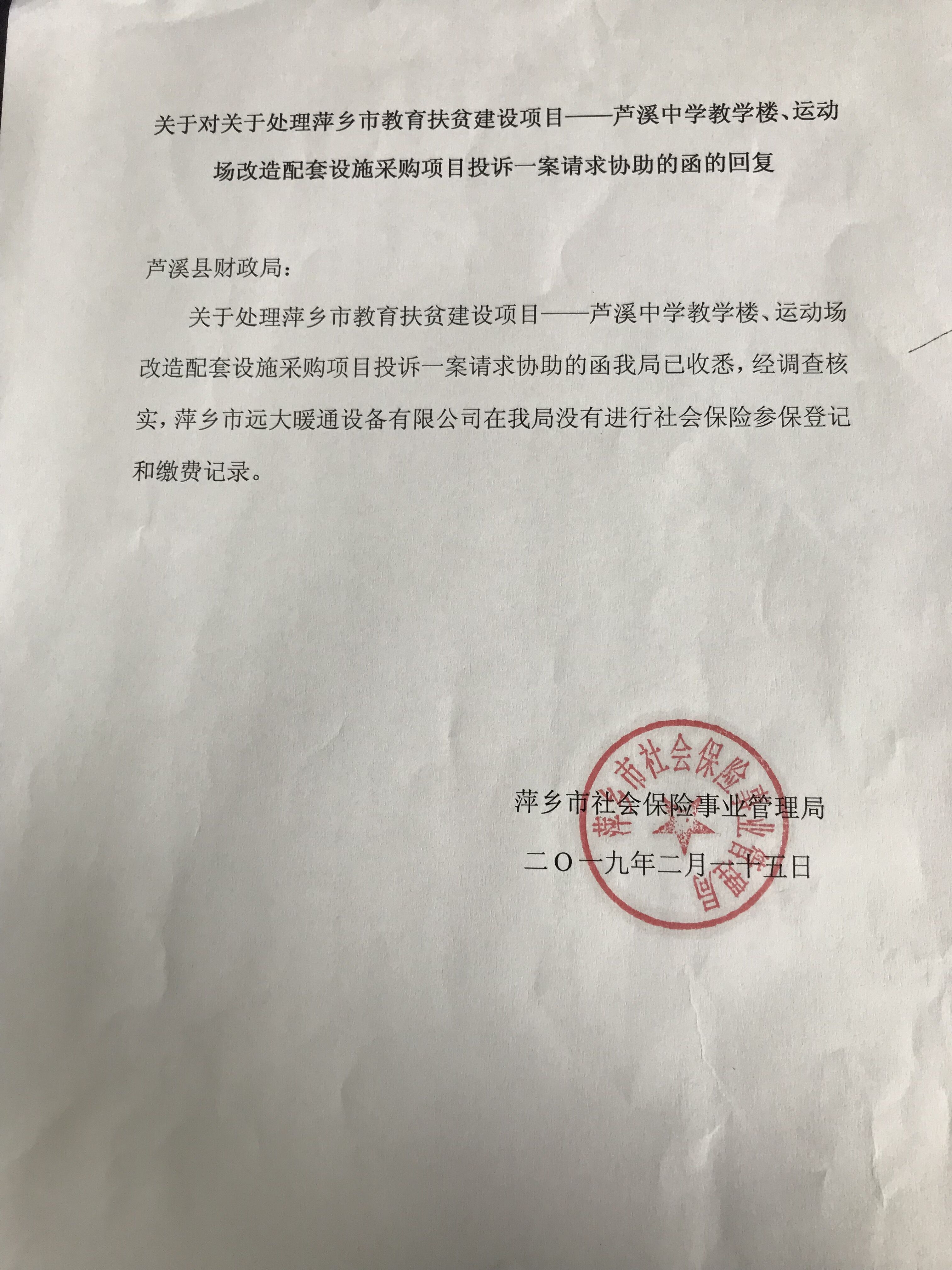 你公司于2019年1月3日9:30参加由萍乡市鑫源工程造价审计有限责任公司组织的萍乡市芦溪县教育扶贫建设项目——芦溪中学教学楼、运动场改配套空调设施采购项目(采购编号2018B000131862重招1)政府采购活动,投标文件中所提供的资审文件第八页的依法缴纳社保凭证涉嫌造假。经审查,根据该项目招标文件中第五部分资审文件第一条第六款规定:良好的社会保障证明,评审依据:提供2018年度任意一个月份缴纳社会保险发票复印件加盖公章,原件备查。根据资料显示,你公司提供的社会保险费缴款专用收据是2017年度的,该复印票据月份显示不清楚,编号字体不清晰,识别难度很大,我单位于2019年2月15日向萍乡市社会保险管理局发出协助函并且派人进行调查取证。经调查核实,你单位没有在萍乡市社会保险管理局进行社会保险参保登记和缴费记录。资审文件中的社会保险缴费证明是一张造假的复印票据。在我单位依法对该投诉事件进行调查取证时,你公司未配合我单位的检查,多次拒绝接听电话,未对我财政部门2019年1月30日发出的投诉答复函通知书要求进行答复。综上所述,本单位认定你公司在该项目的投标活动中涉嫌提供虚假材料参与投标,拒绝财政监督检查。