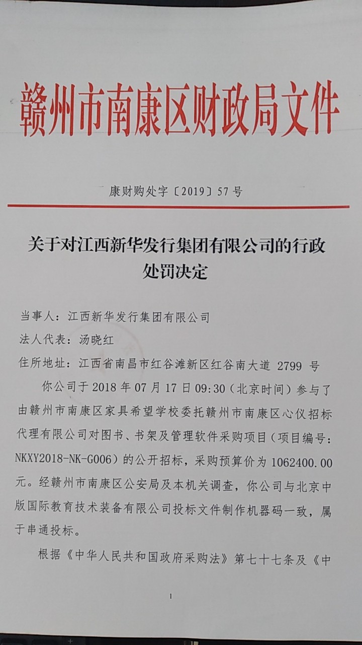 你公司于2018年07月17日09:30(北京时间)参与了由赣州市南康区家具希望学校委托赣州市南康区心仪招标代理有限公司对图书、书架及管理软件采购项目(项目编号:NKXY2018-NK-G006)的公开招标,采购预算价为1062400.00元。经赣州市南康区公安局及本机关调查,你公司与北京中版国际教育技术装备有限公司投标文件制作机器码一致,属于串通投标。