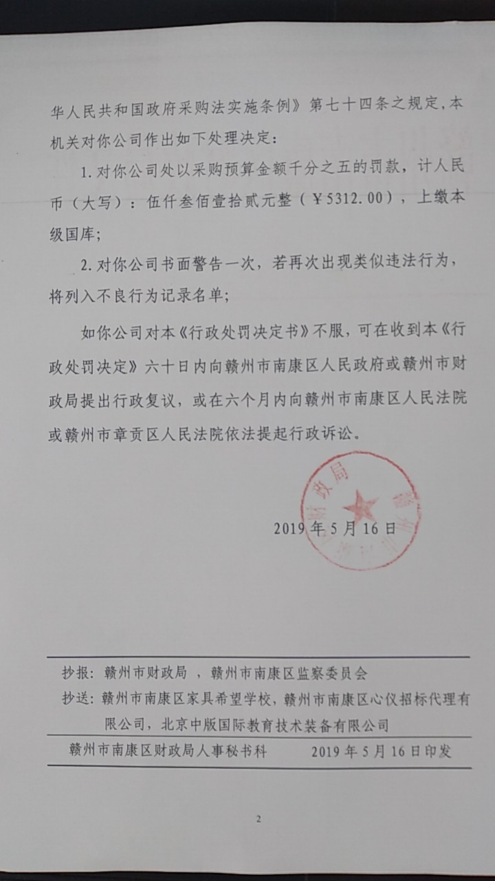 1.对你公司处以采购预算金额千分之五的罚款,计人民币(大写):伍仟叁佰壹拾贰元整(¥5312.00),上缴本级国库;
