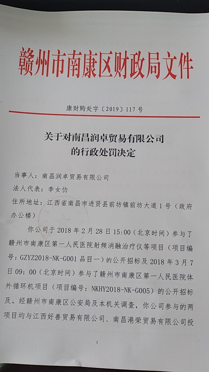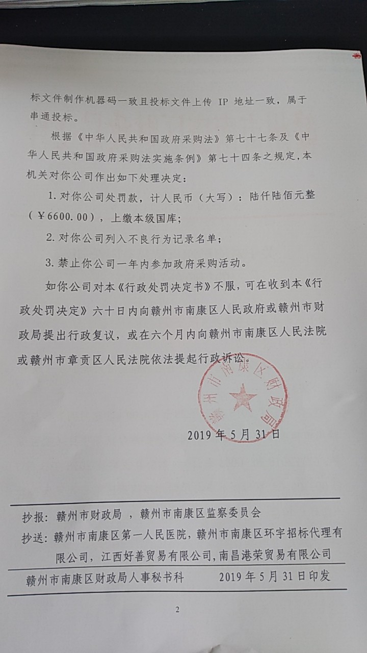 你公司于2018年2月28日15:00(北京时间)参与了赣州市南康区第一人民医院射频消融治疗仪等项目(项目编号:GZYZ2018-NK-G001品目一)的公开招标及2018年3月7日09:00(北京时间)参与了赣州市南康区第一人民医院体外循环机项目(项目编号:NKHY2018-NK-G005)的公开招标及。经赣州市南康区公安局及本机关调查,你公司参与的两项目均与江西好善贸易有限公司、南昌港荣贸易有限公司投标文件制作机器码一致且投标文件上传IP地址一致,属于串通投标。