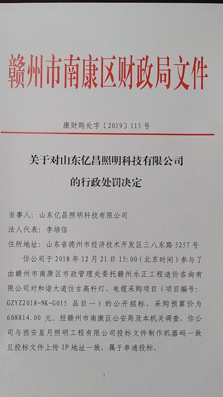 你公司于2018年12月21日15:00(北京时间)参与了由赣州市南康区市政管理处委托赣州永正工程造价咨询有限公司对和谐大道仿古高杆灯、电缆采购项目(项目编号:GZYZ2018-NK-G015品目一)的公开招标,采购预算价为608814.00元。经赣州市南康区公安局及本机关调查,你公司与西安星月照明工程有限公司投标文件制作机器码一致且投标文件上传IP地址一致,属于串通投标。
