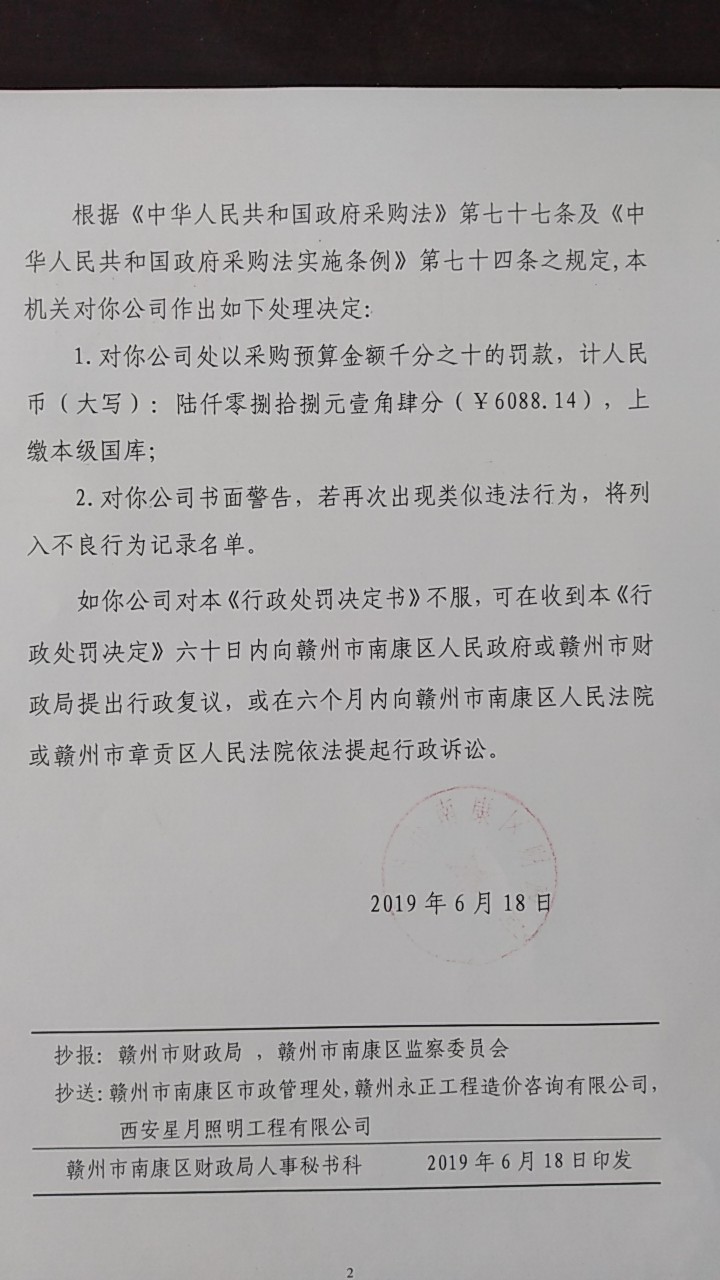 1.对你公司处以采购预算金额千分之十的罚款,计人民币(大写):陆仟零捌拾捌元壹角肆分(¥6088.14),上缴本级国库;