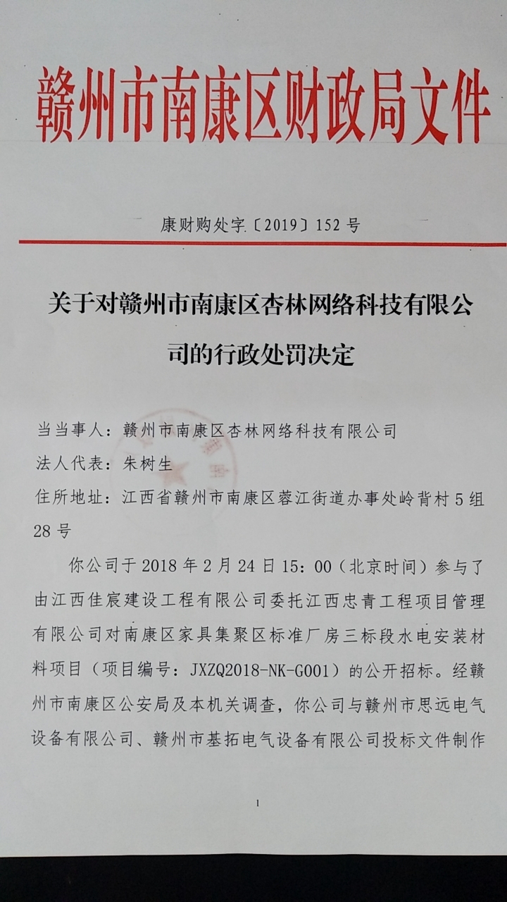 关于对赣州市南康区杏林网络科技有限公司的行政处罚决定