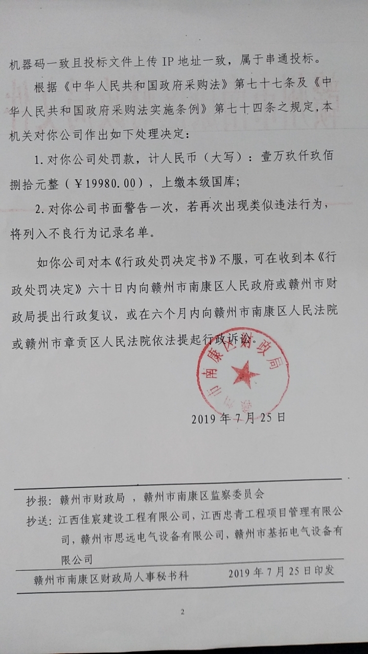你公司于2018年2月24日15:00(北京时间)参与了由江西佳宸建设工程有限公司委托江西忠青工程项目管理有限公司对南康区家具集聚区标准厂房三标段水电安装材料项目(项目编号:JXZQ2018-NK-G001)的公开招标。经赣州市南康区公安局及本机关调查,你公司与赣州市思远电气设备有限公司、赣州市基拓电气设备有限公司投标文件制作机器码一致且投标文件上传IP地址一致,属于串通投标。