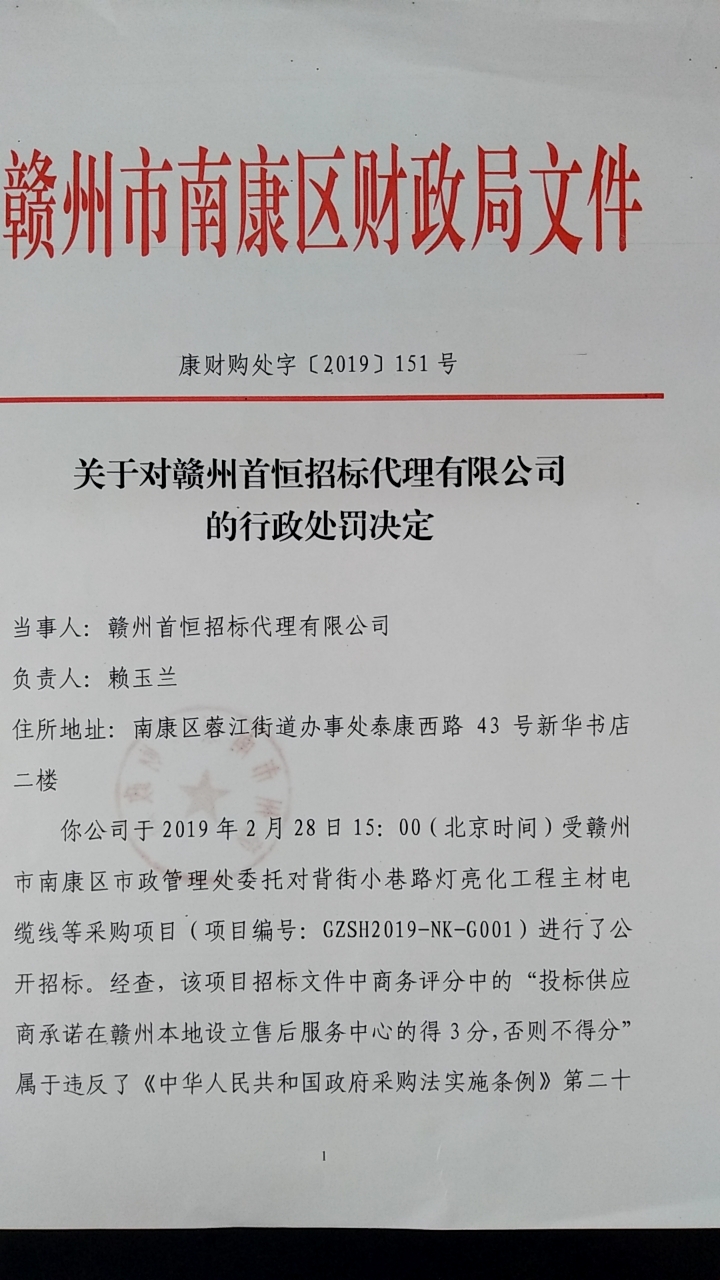 你公司于2019年2月28日15:00(北京时间)受赣州市南康区市政管理处委托对背街小巷路灯亮化工程主材电缆线等采购项目(项目编号:GZSH2019-NK-G001)进行了公开招标。经查,该项目招标文件中商务评分中的“投标供应商承诺在赣州本地设立售后服务中心的得3分,否则不得分”属于违反了《中华人民共和国政府采购法实施条例》第二十条“以不合理的条件对供应商实行差别待遇或者歧视待遇”的情形。