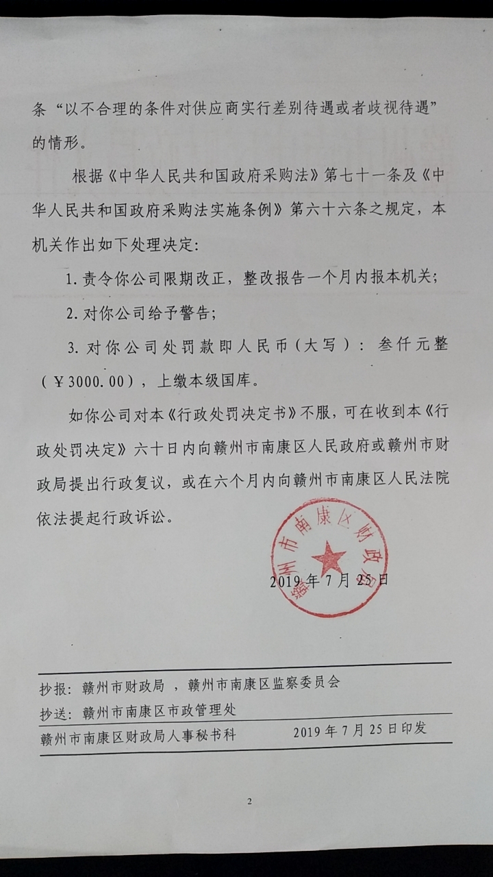 如你公司对本《行政处罚决定书》不服,可在收到本《行政处罚决定》六十日内向赣州市南康区人民政府或赣州市财政局提出行政复议,或在六个月内向赣州市南康区人民法院依法提起行政诉讼。