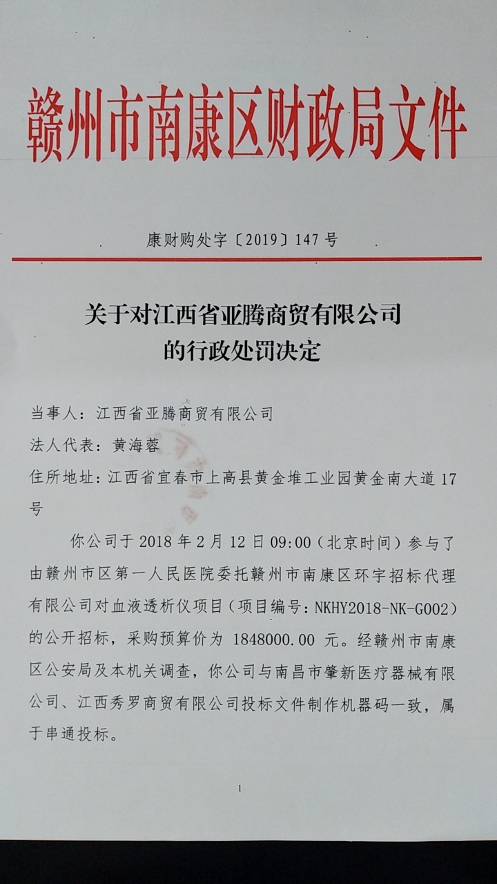 你公司于2018年2月12日09:00(北京时间)参与了由赣州市区第一人民医院委托赣州市南康区环宇招标代理有限公司对血液透析仪项目(项目编号:NKHY2018-NK-G002)的公开招标,采购预算价为1848000.00元。经赣州市南康区公安局及本机关调查,你公司与南昌市肇新医疗器械有限公司、江西秀罗商贸有限公司投标文件制作机器码一致,属于串通投标。