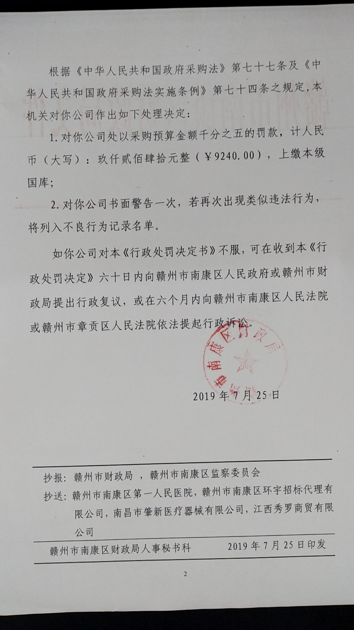 1.对你公司处以采购预算金额千分之五的罚款,计人民币(大写):玖仟贰佰肆拾元整(¥9240.00),上缴本级国库;