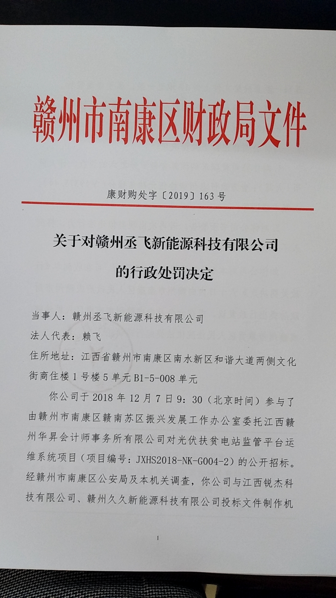 你公司于2018年12月7日9:30(北京时间)参与了由赣州市南康区赣南苏区振兴发展工作办公室委托江西赣州华昇会计师事务所有限公司对光伏扶贫电站监管平台运维系统项目(项目编号:JXHS2018-NK-G004-2)的公开招标。经赣州市南康区公安局及本机关调查,你公司与江西锐杰科技有限公司、赣州久久新能源科技有限公司投标文件制作机器码一致且投标文件上传IP地址一致,属于串通投标。