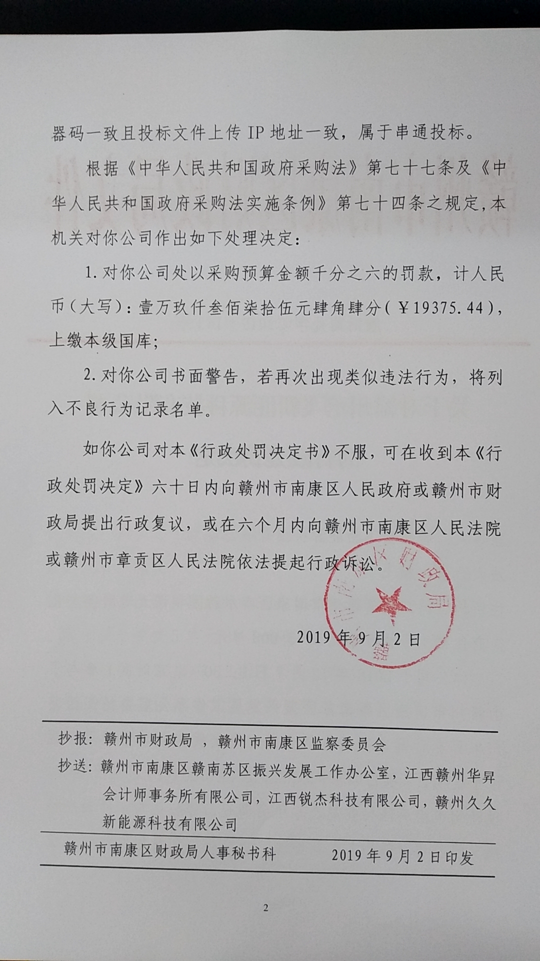1.对你公司处以采购预算金额千分之六的罚款,计人民币(大写):壹万玖仟叁佰柒拾伍元肆角肆分(¥19375.44),上缴本级国库;