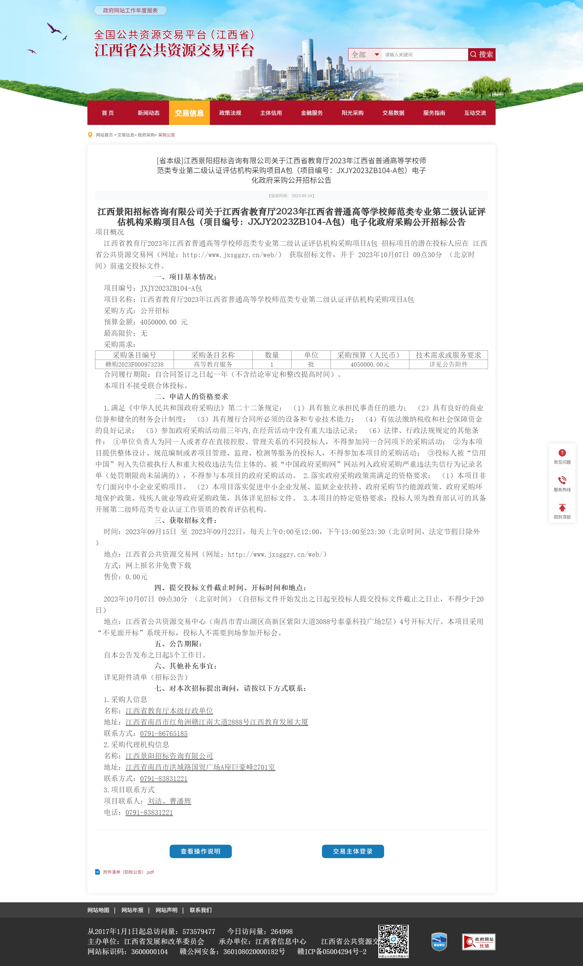 江西省教育厅2023年江西省普通高等学校师范类专业第二级认证评估机构采购项目A包 招标项目的潜在投标人应在 江西省公共资源交易网(网址:http://www.jxsggzy.cn/web/) 获取招标文件,并于 2023年10月07日 09点30分 (北京时间)前递交投标文件。