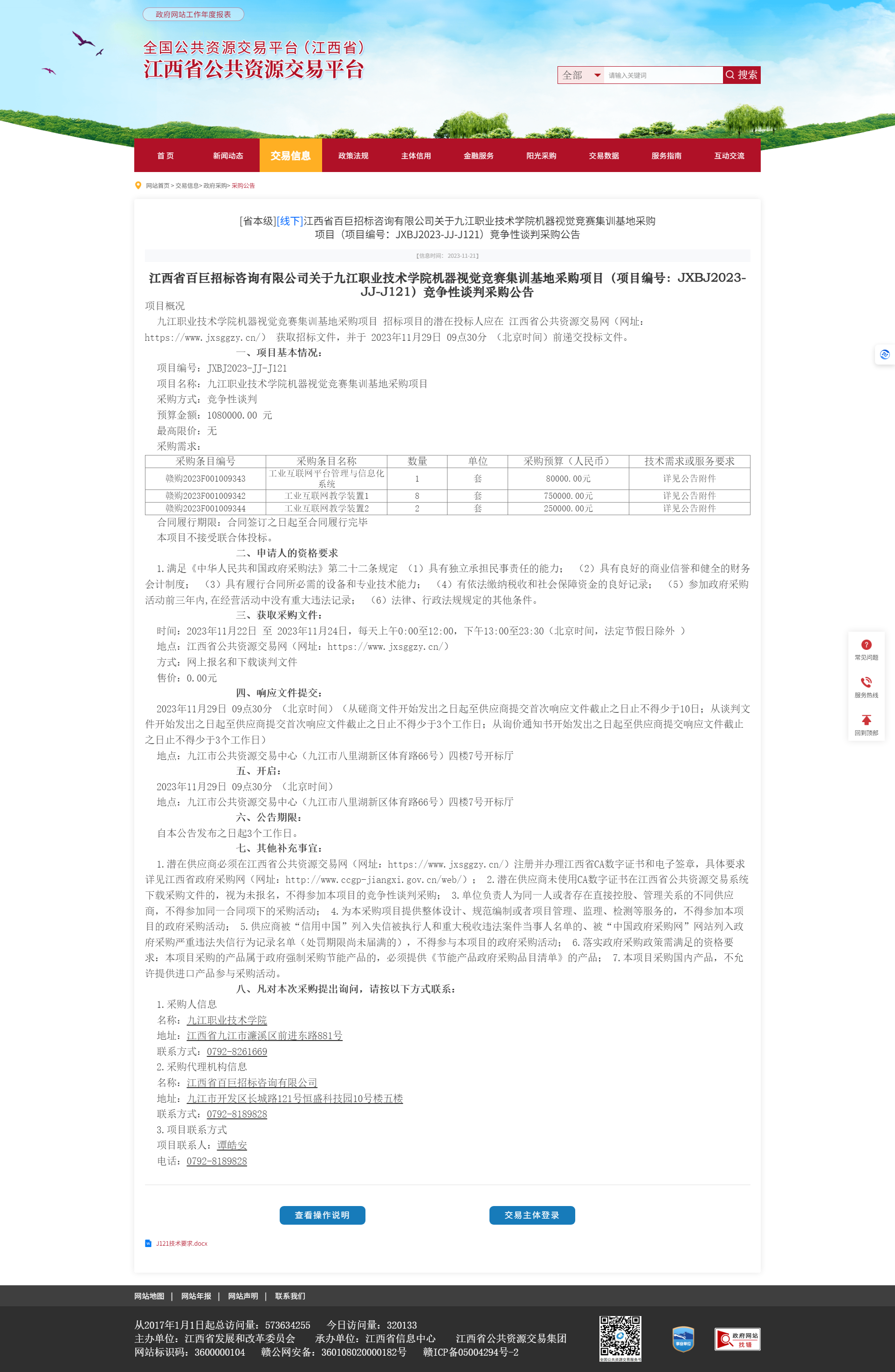 江西省百巨招标咨询有限公司关于九江职业技术学院机器视觉竞赛集训基地采购项目(项目编号:JXBJ2023-JJ-J121)竞争性谈判采购公告