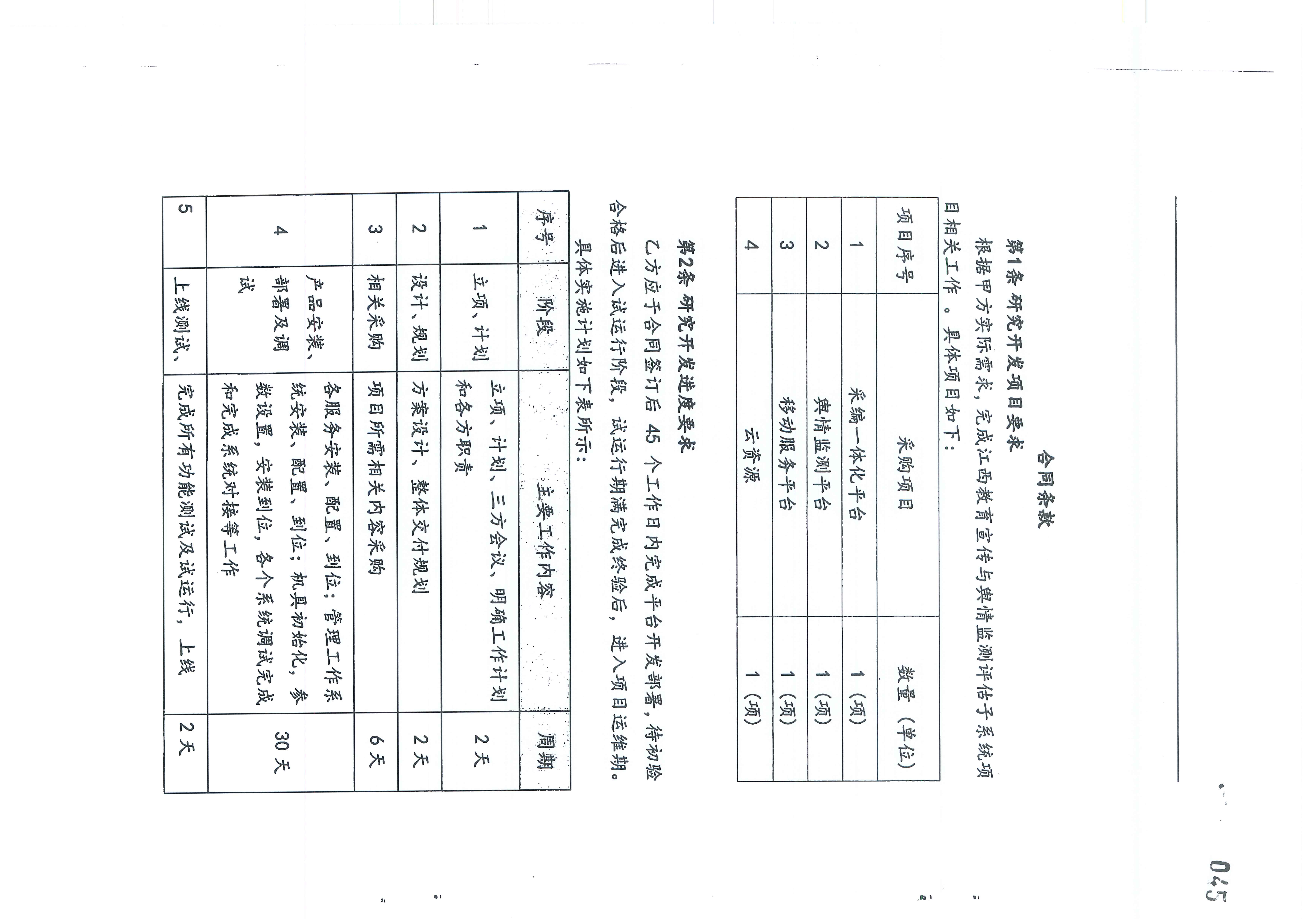 | 江西教育宣传与舆情监测评估子系统 | 升级采编一体化平台、舆情监测平台、移动服务平台,部署系统所需求的国产操作系统、国产数据库、国产中间件产品,云租赁服务。 | 系统密码应用安全性应符合相关部门组织的密码应用安全性评估审查要求,系统涉及的身份认证、访问控制、数据保护、可信服务、安全审计等安全防护措施必须采用国密局审批通过可应用的国产密码算法或国产密码产品。 | 合同签订后45个工作日内完成平台开发部署,待初验合格后进入试运行阶段,试运行为3个月,试运行期满完成终验后,进入项目运维期。自实施完成并验收通过之日起承诺采编一体化平台和移动服务平台免费质量保证期至少为两年,舆情监测平台免费质量保证期至少为三年,并对应用软件提供免费的升级、维护服务。 | 系统设计必须遵循国家相关法律、法规,参照国家和江西省信息化建设标准,遵循教育信息化建设相关技术标准,尤其是计算机信息系统安全的有关标准、要求。 |