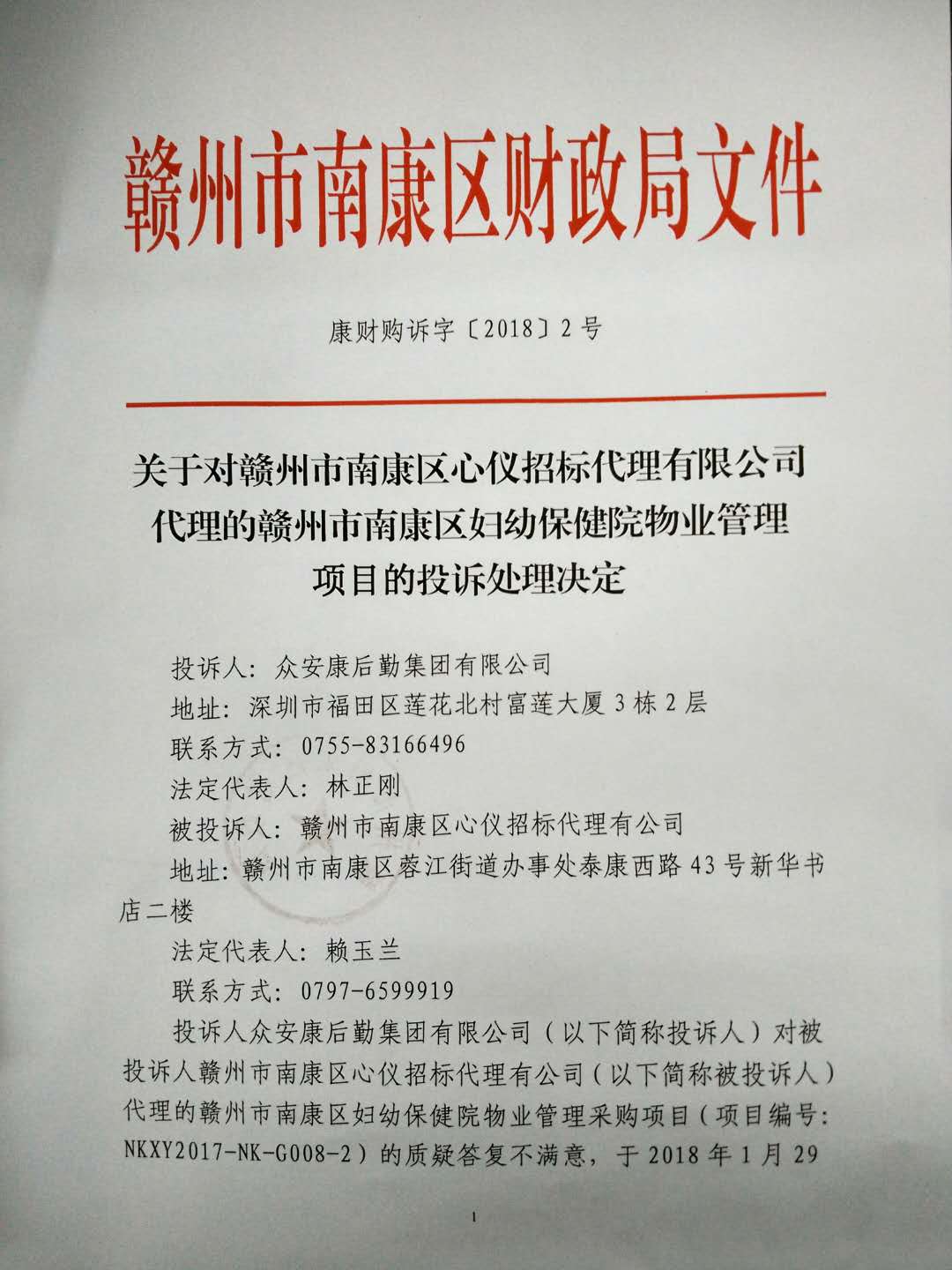 投诉人众安康后勤集团有限公司(以下简称投诉人)对被投诉人赣州市南康区心仪招标代理有公司(以下简称被投诉人)代理的赣州市南康区妇幼保健院物业管理采购项目(项目编号:NKXY2017-NK-G008-2)的质疑答复不满意,于2018年1月29日向我局进行投诉。经依法对本项目政府采购活动中的相关材料进行审查,现本投诉案已审查终结。