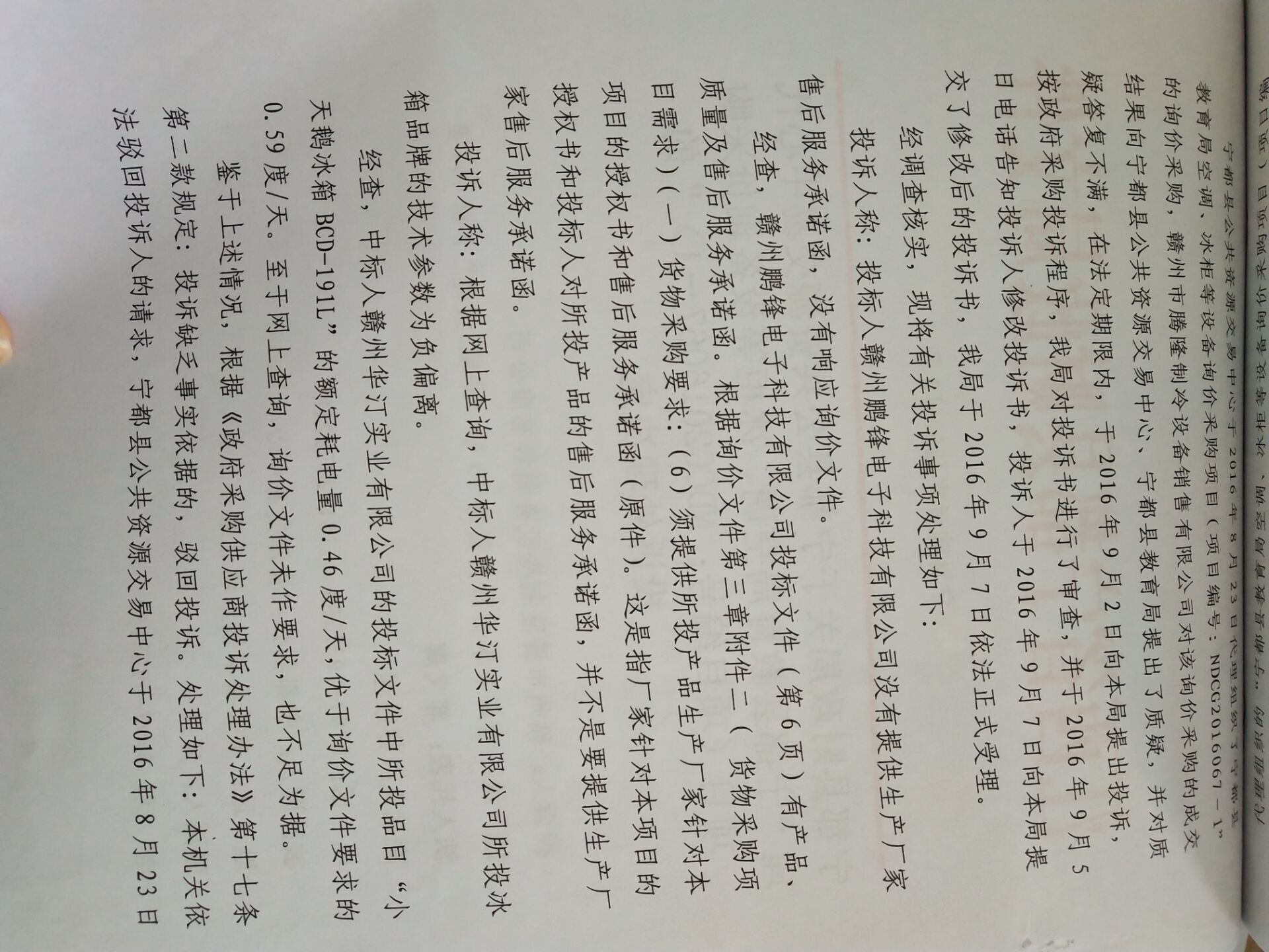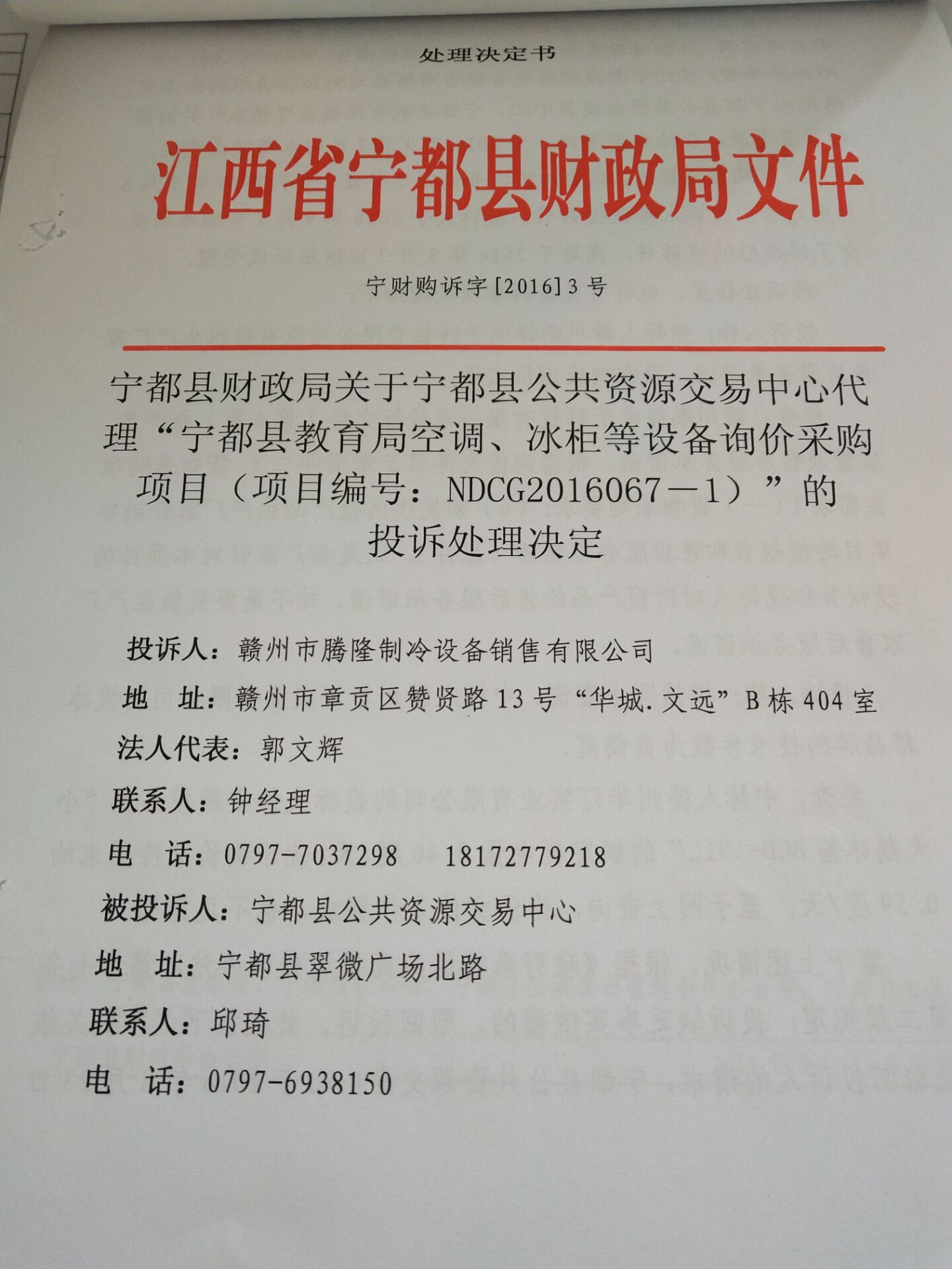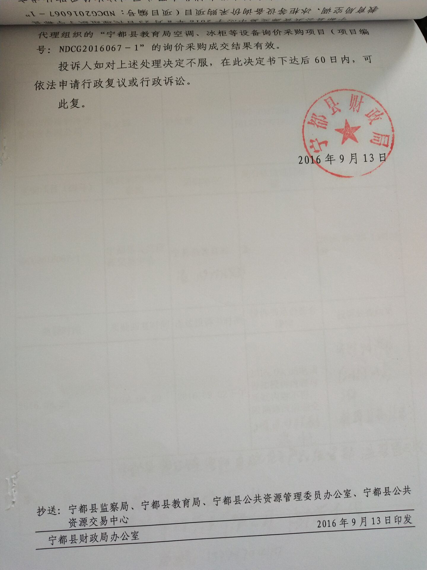 关于宁都县教育局空调、冰柜等设备询价采购项目的投诉处理决定