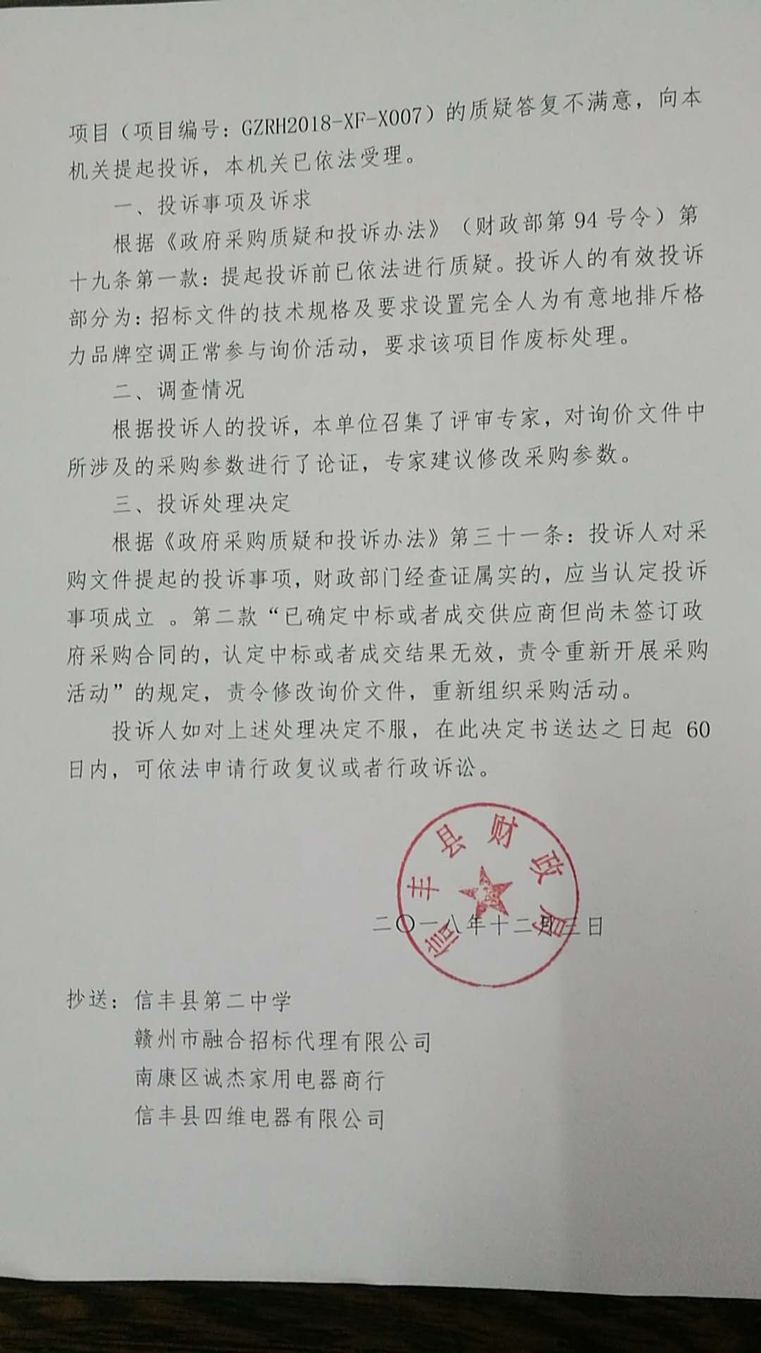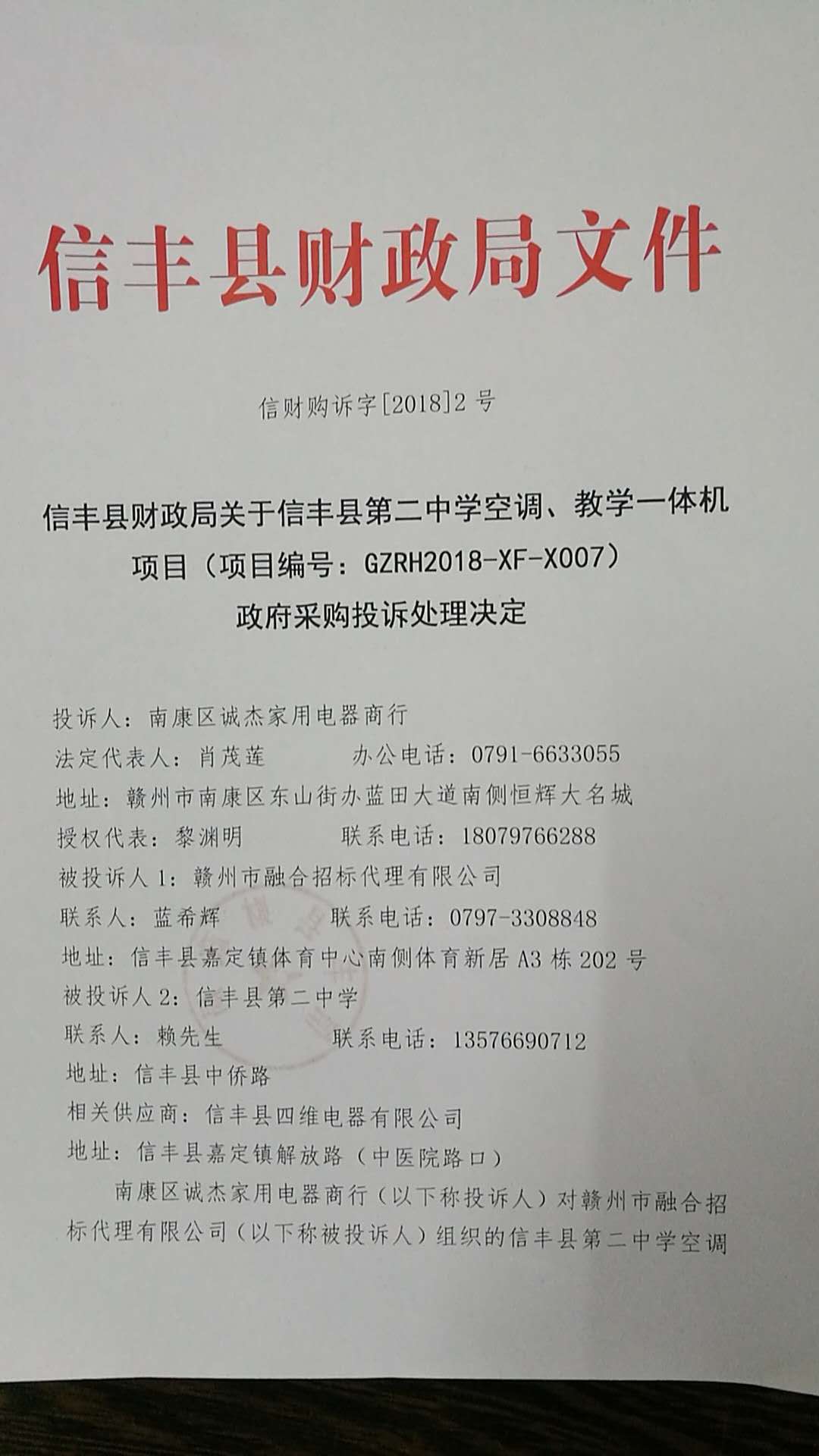信丰县财政局关于信丰县第二中学空调、教学一体机项目(项目编号:GZRH2018-XF-X007)政府采购投诉处理决定