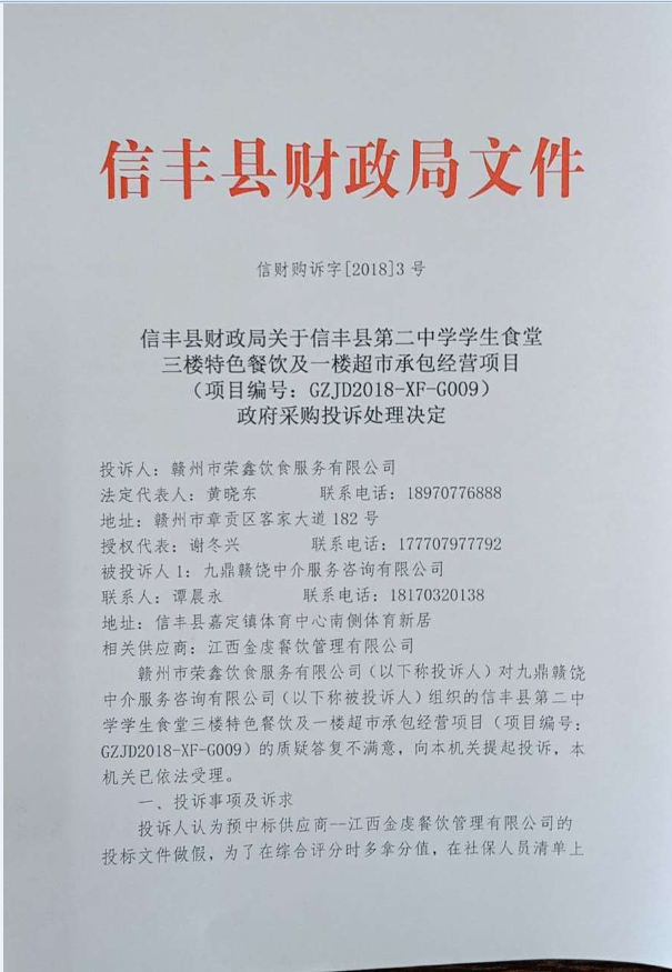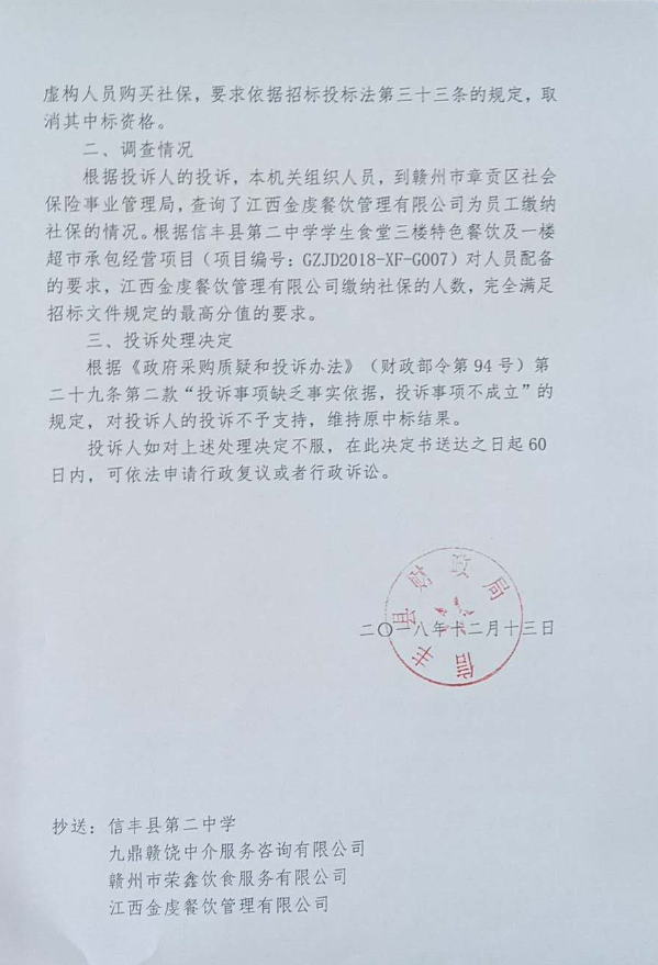 信丰县财政局关于信丰县第二中学学生食堂三楼特色餐饮及一楼超市承包经营项目(项目编号:GZJD2018-XF-G009)政府采购投诉处理决定