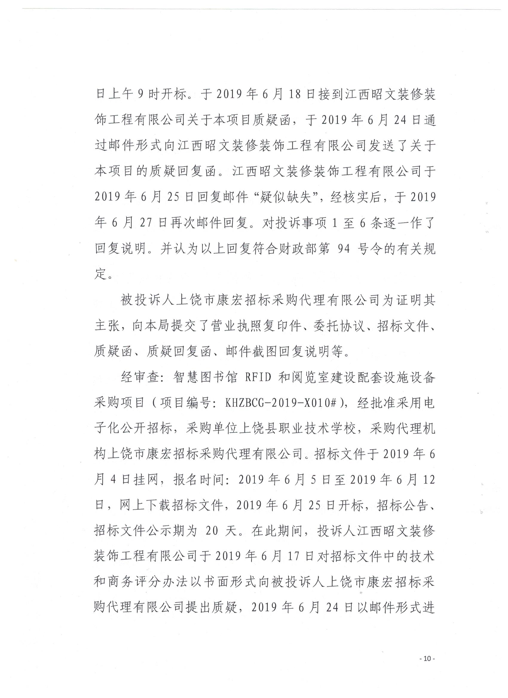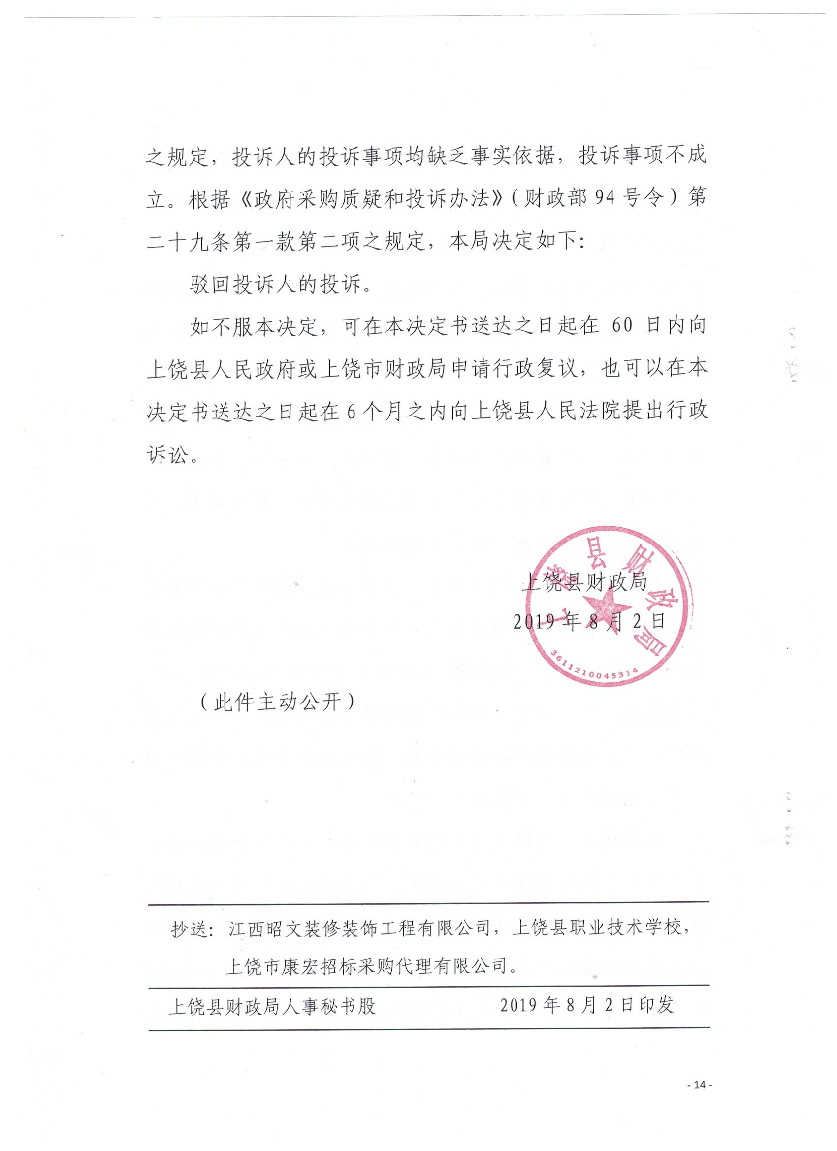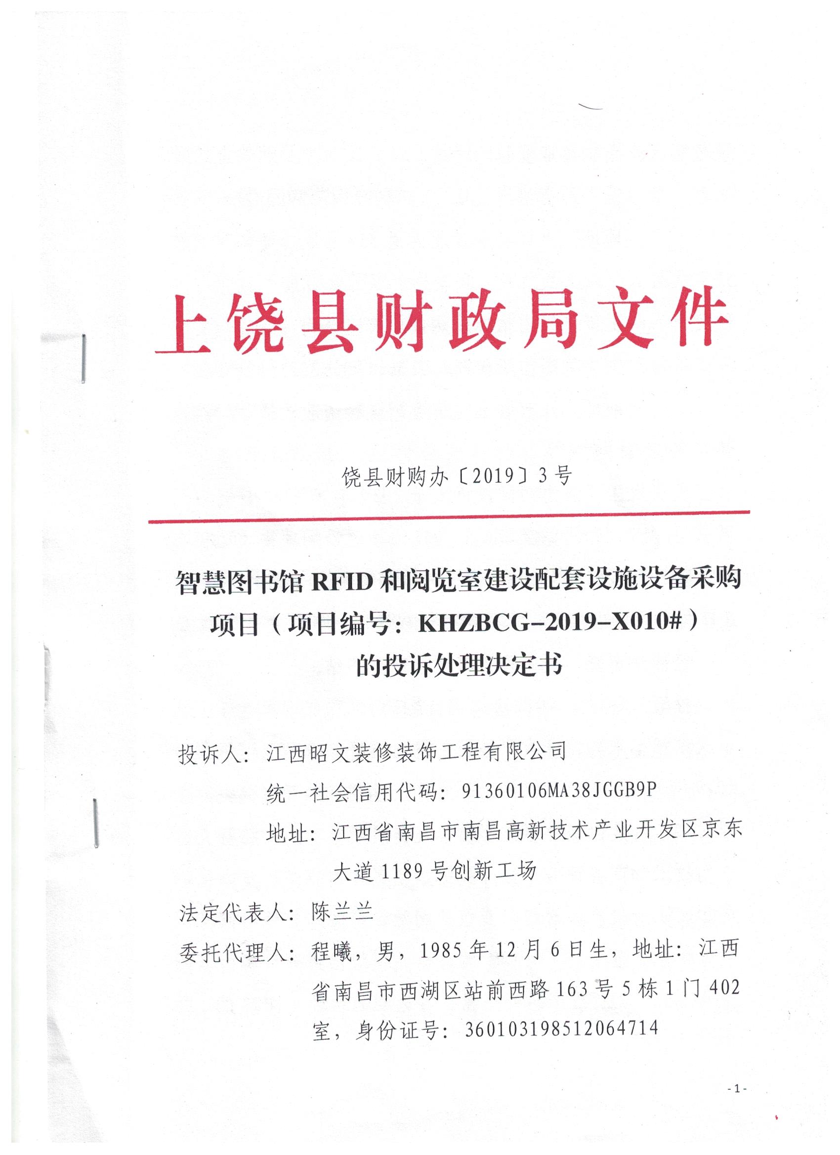 上饶县财政局投诉处理决定书 饶县财购办[2019]3号