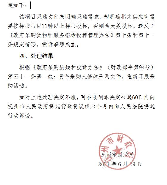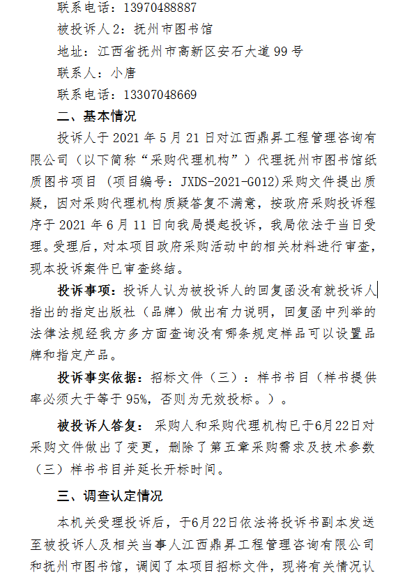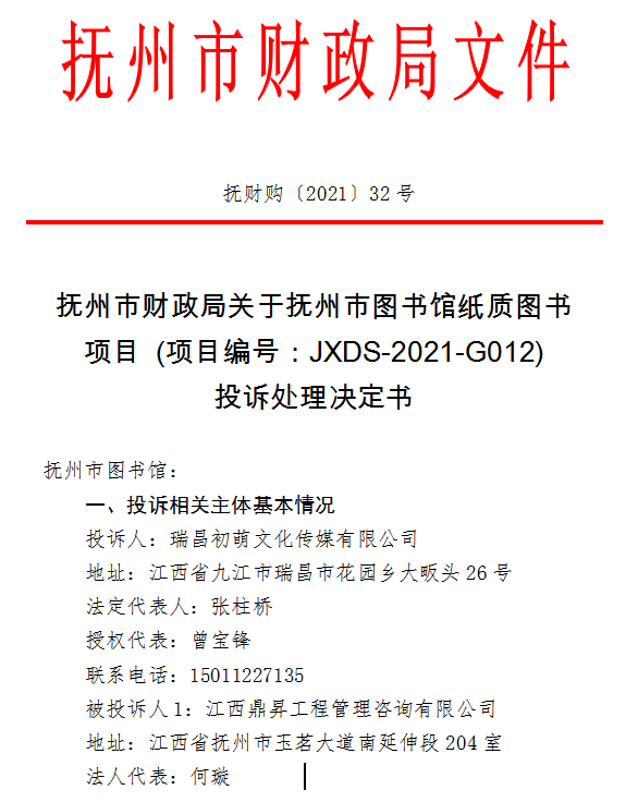 抚州市财政局关于抚州市图书馆纸质图书项目 (项目编号:JXDS-2021-G012) 投诉处理决定书