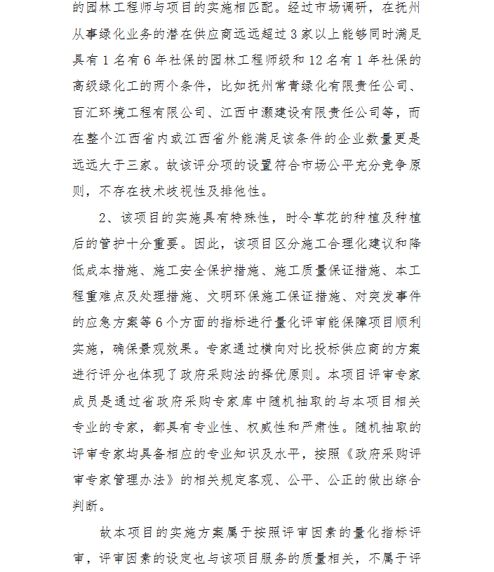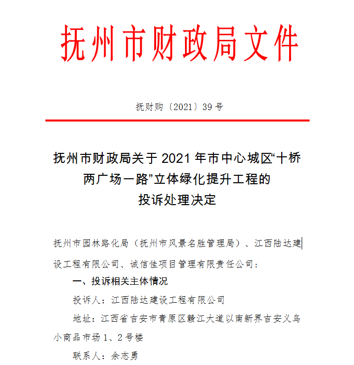 抚州市财政局关于2021年市中心城区“十桥两广场一路”立体绿化提升工程的 投诉处理决定