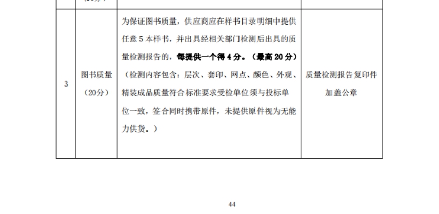1、项目基本情况:景德镇第二高级职业中学纸质图书项目(项目编号:XLCG20211119)采购预算80万,采购方式为竞争性磋商,委托江西省熹律工程咨询有限公司代理采购该项目,采购代理机构和项目业主共同编制了竞争性磋商文件。其中竞争性磋商文件第39页关于图书样书清单、第44页关于质量检测报告的评分项内容如下: