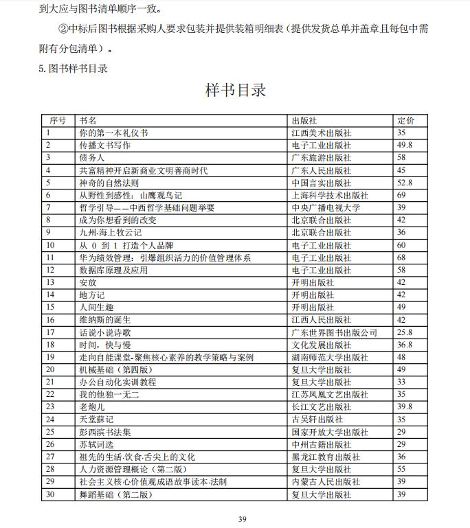 1、图书是特殊商品,每种图书从出版发行到市场以来就是唯一的,图书只有明确书目、出版单位、定价等要求才能明确采购需求。《出版管理条例》第二十八条规定了“出版物必须按照国家的有关规定载明作者、出版者、印刷者或者复制者、发行者的名称、地址,书号、刊号或者版号,在版编目数据,出版日期、刊期以及其他有关事项。”图书的书名、出版社、版期、书号等基本图书信息应属于图书本身的技术参数,样书明确书名、出版社等不属于变相指定品牌、型号、产地的行为。
