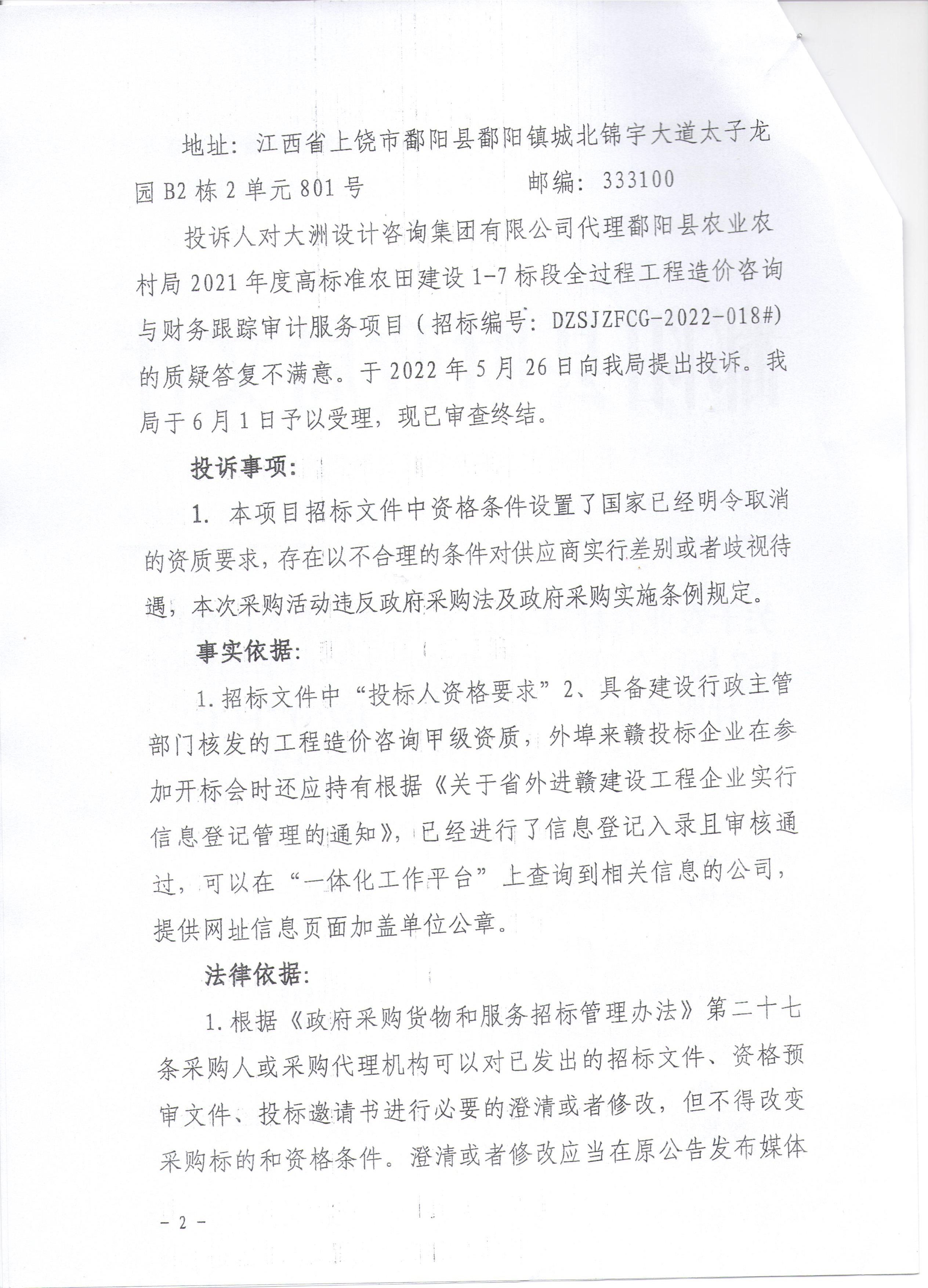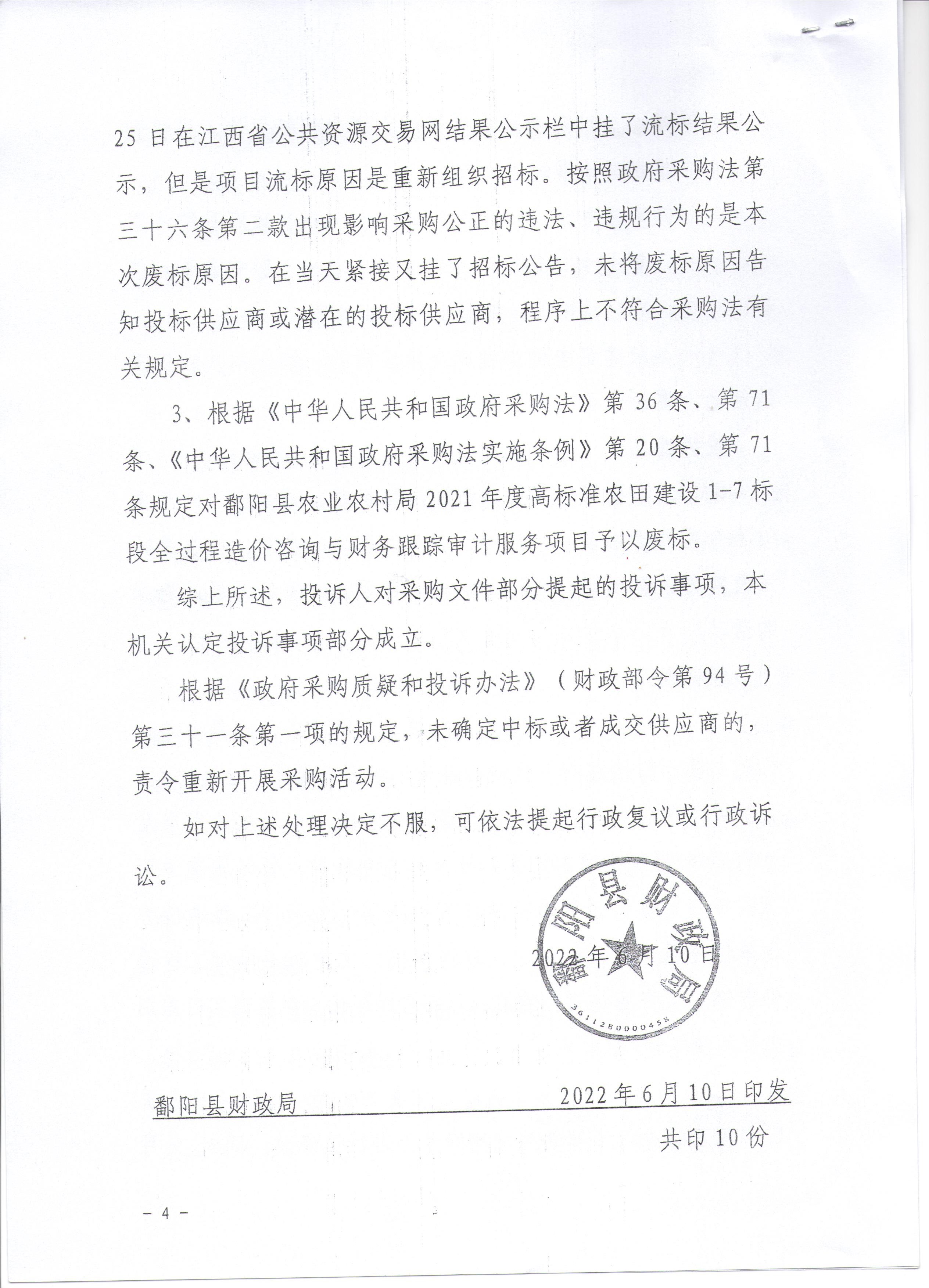 鄱阳县农业农村局高标准农田建设投诉处理决定