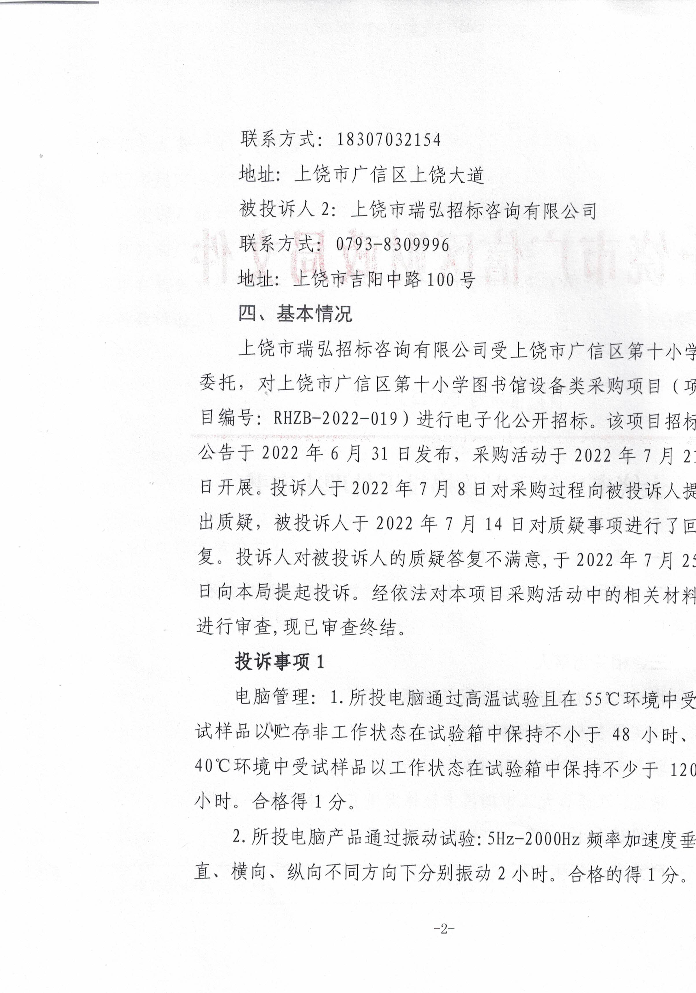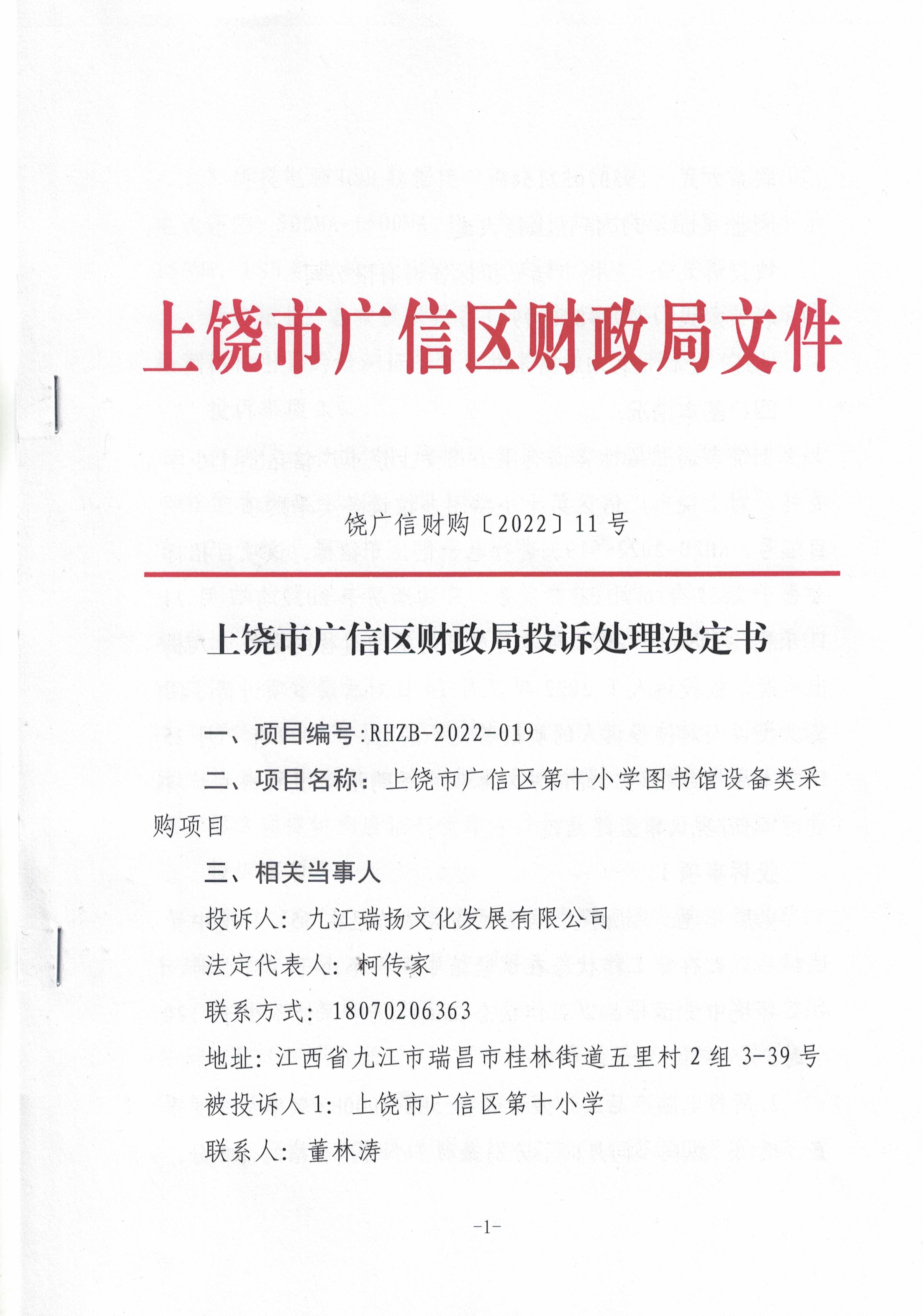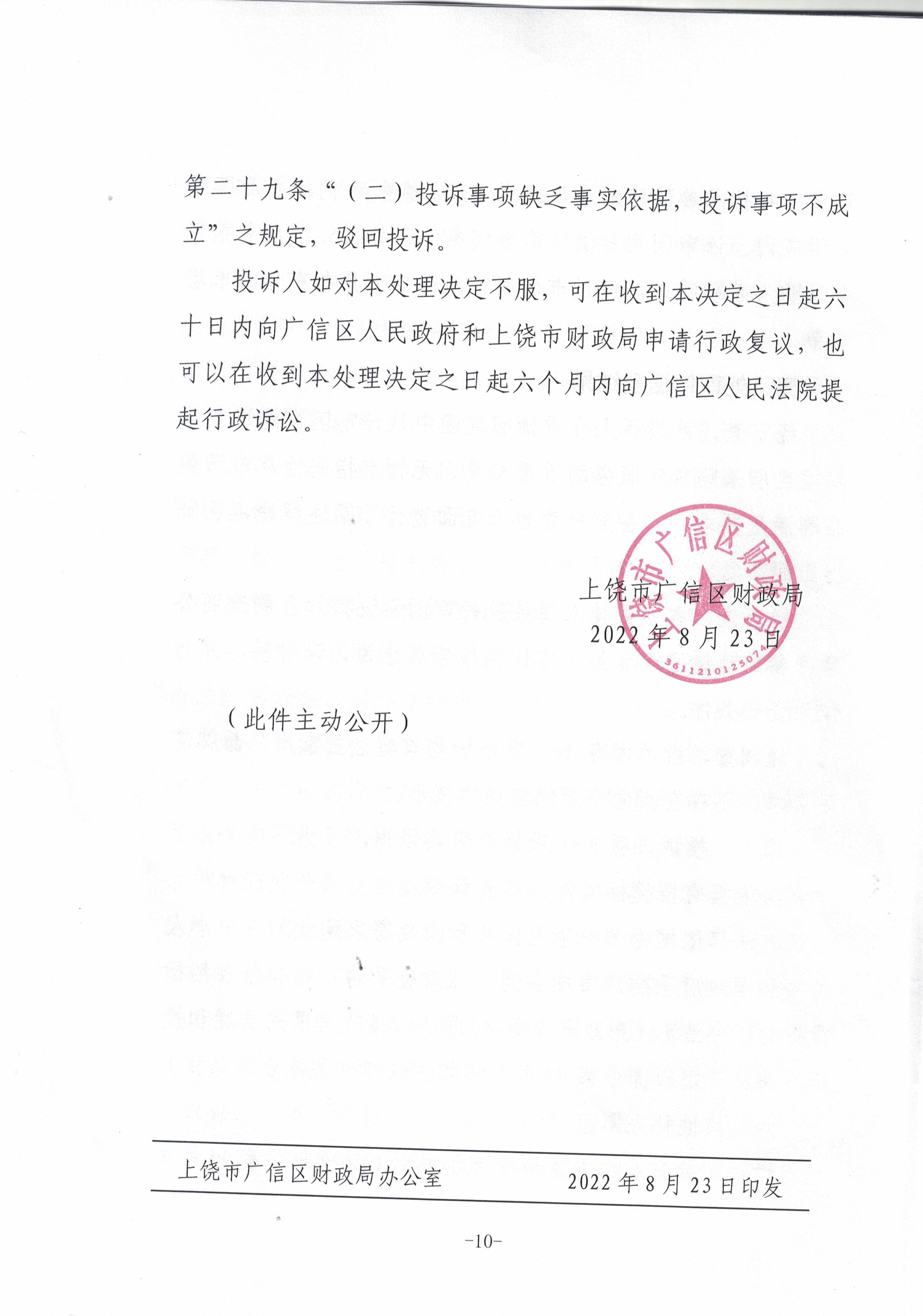 上饶市广信区财政局投诉处理决定书饶广信财购[2022]11号