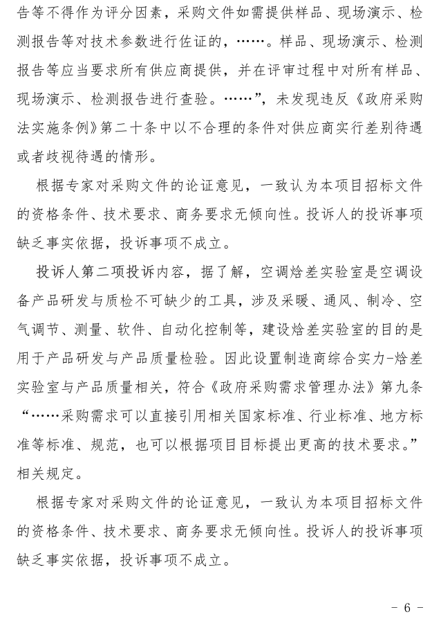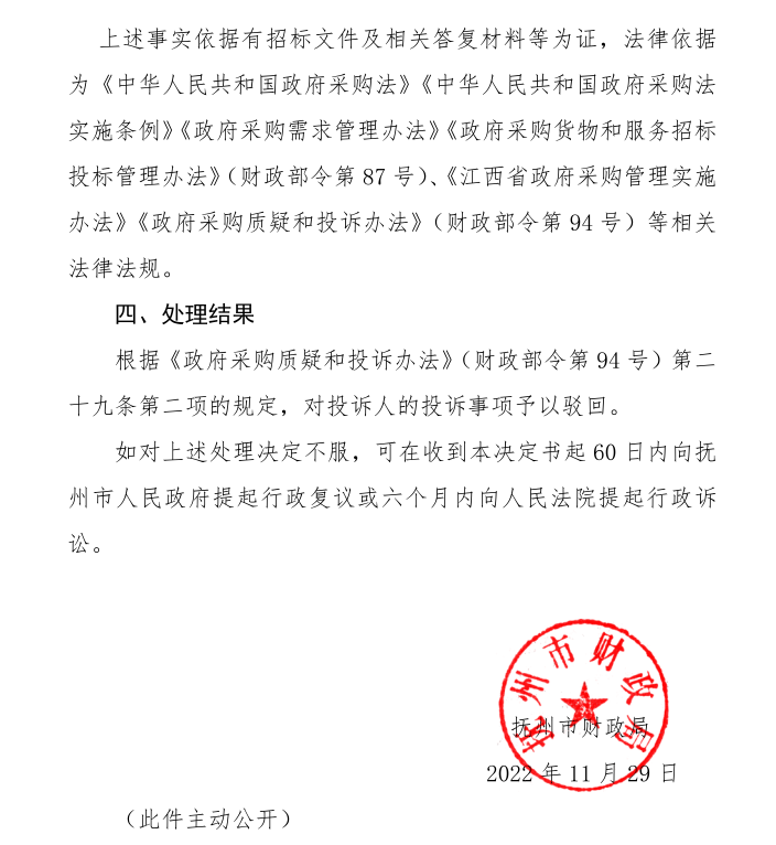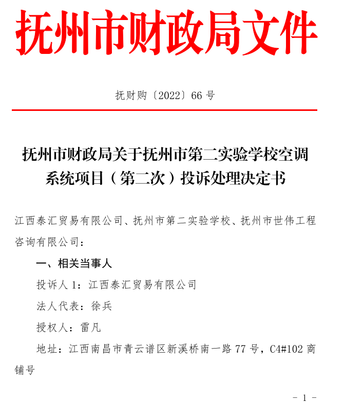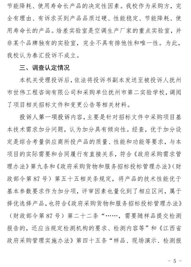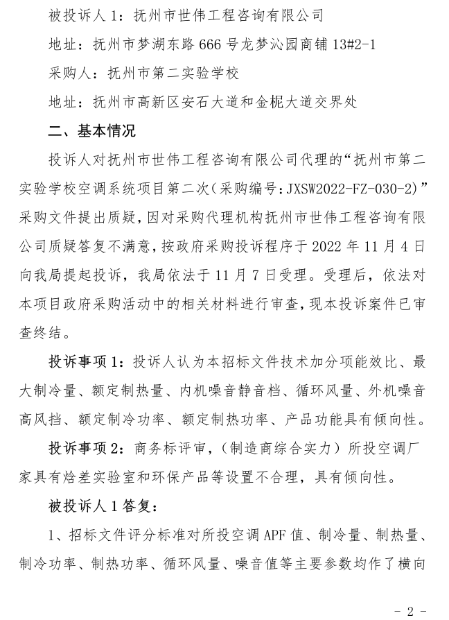 抚州市财政局关于抚州市第二实验学校空调系统项目(第二次)投诉处理决定书
