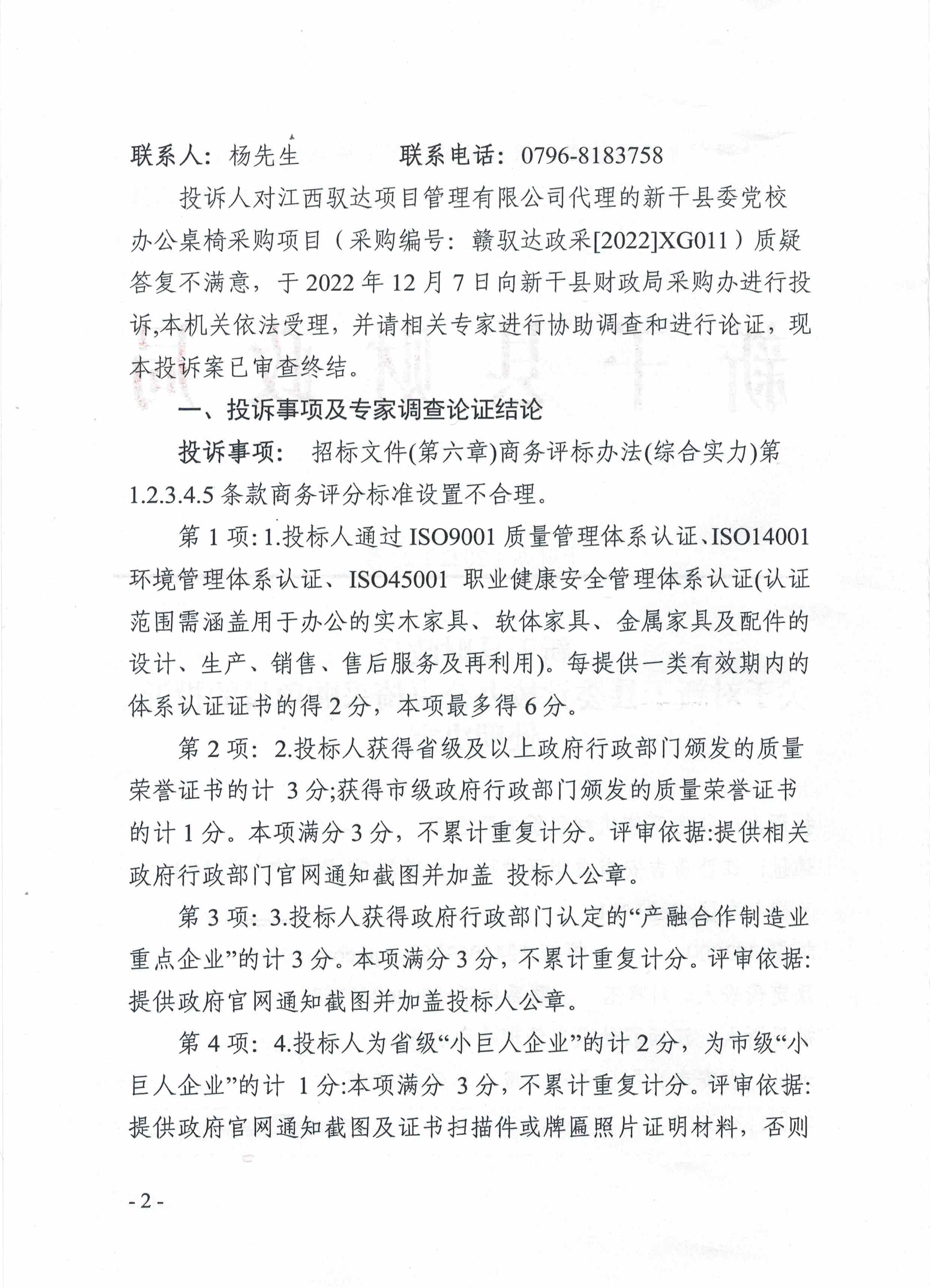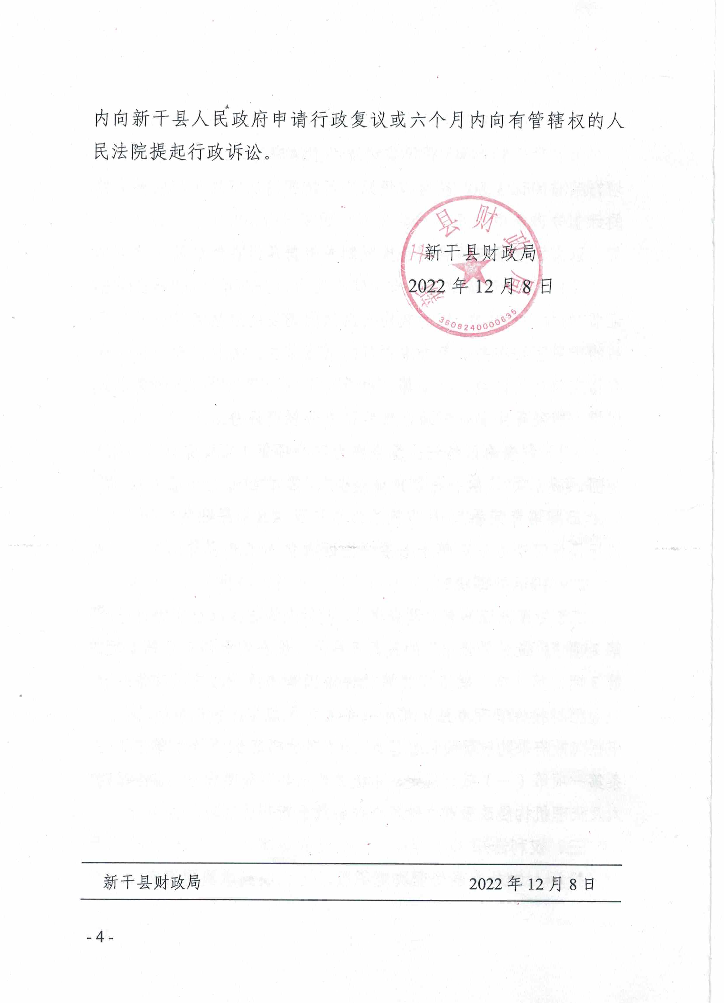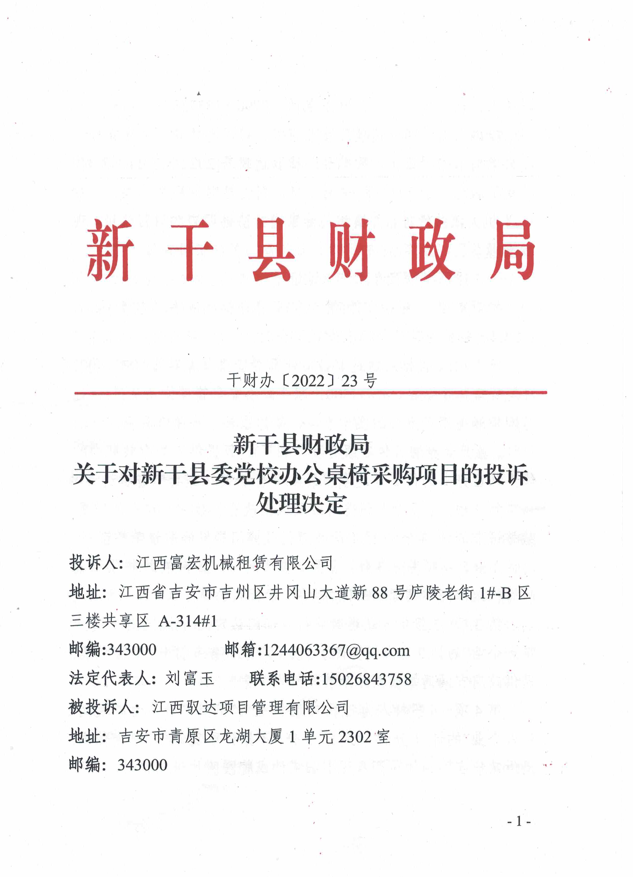 干财办【2022】23号新干县财政局关于对新干县委党校办公桌椅采购项目的投诉处理决定