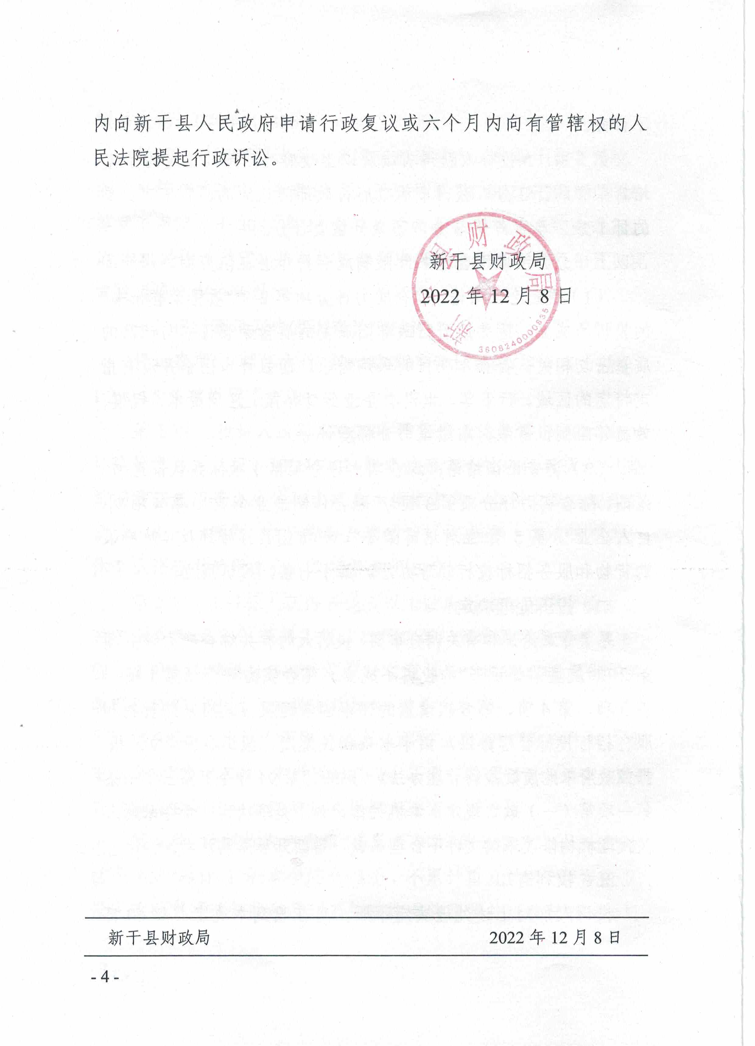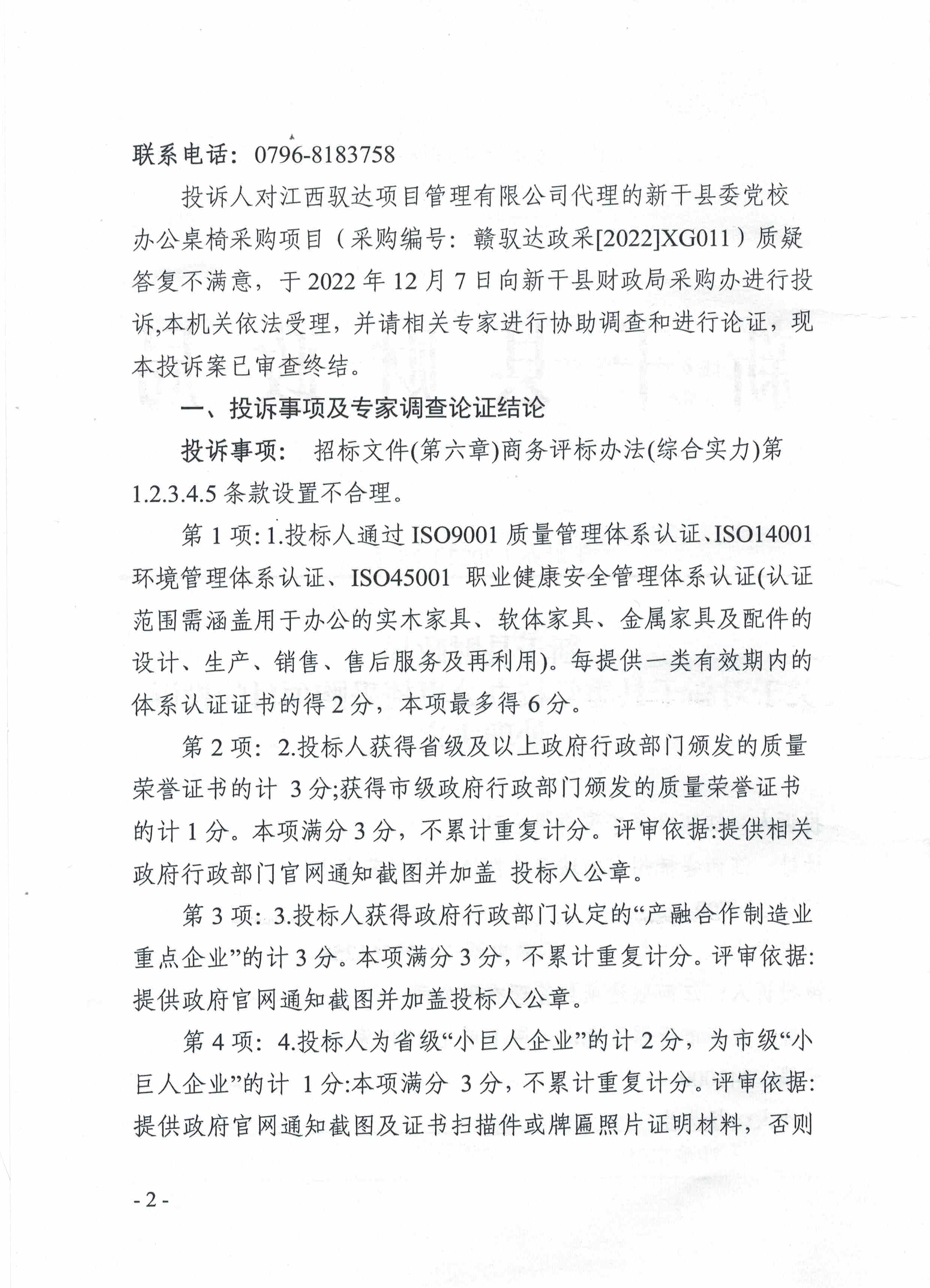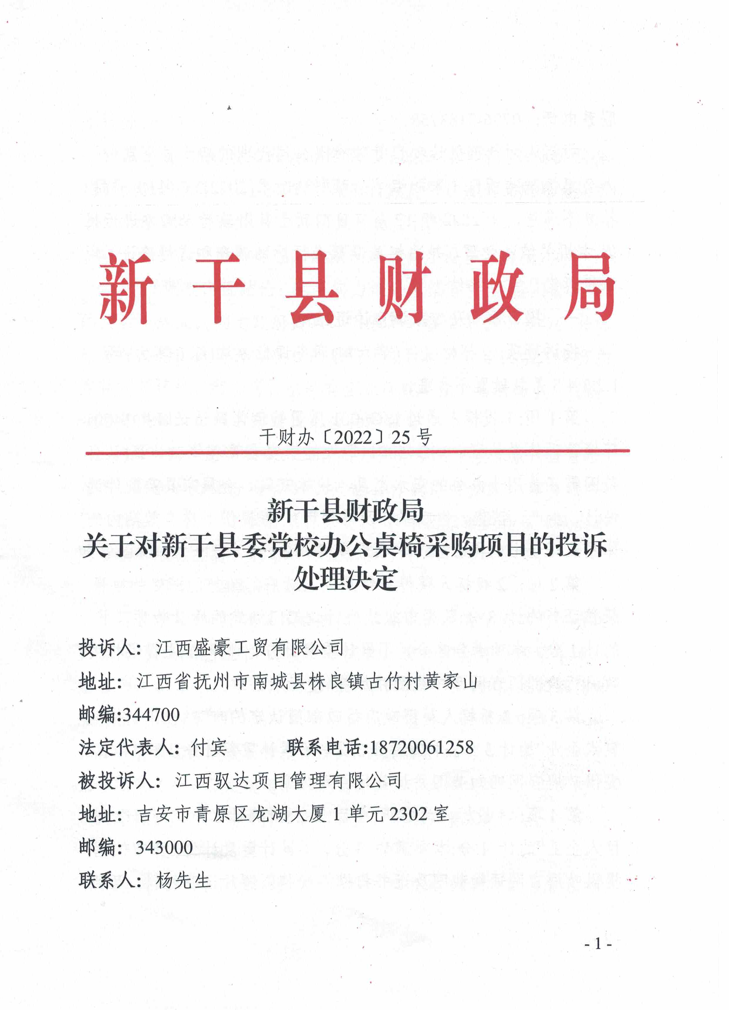 干财办【2022】25号新干县财政局关于对新干县委党校办公桌椅采购项目的投诉处理决定