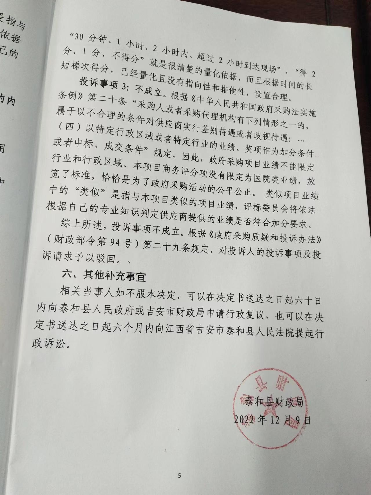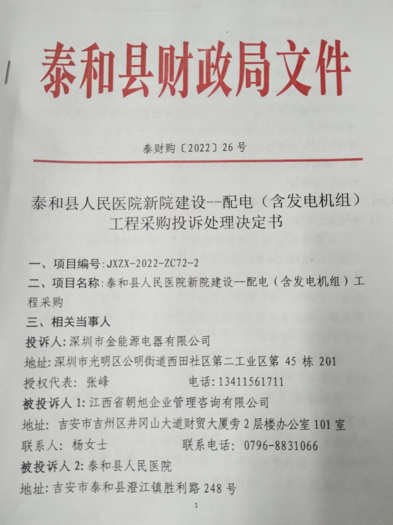 泰和县人民医院新院建设--配电(含发电机组)工程采购投诉处理决定书