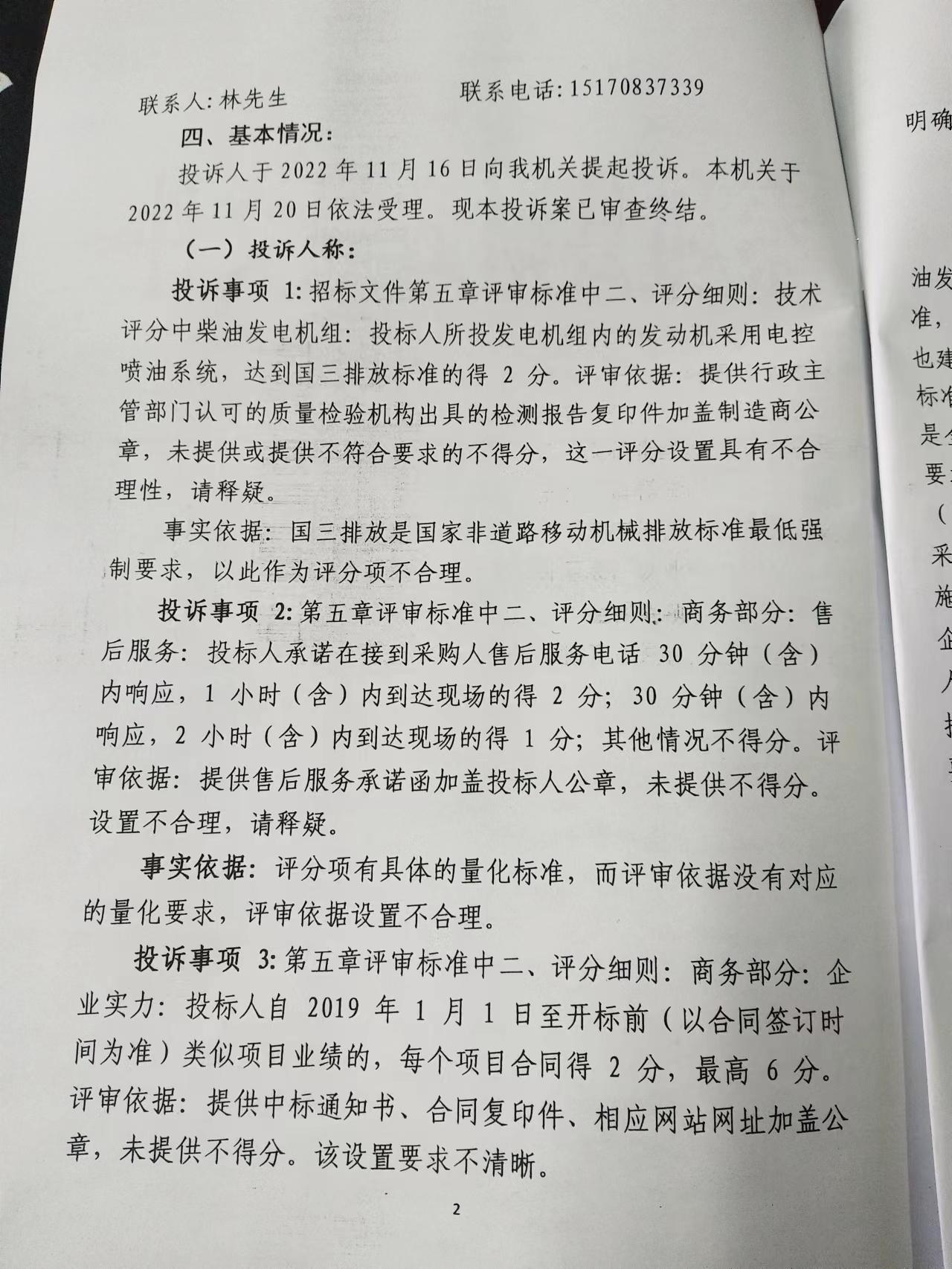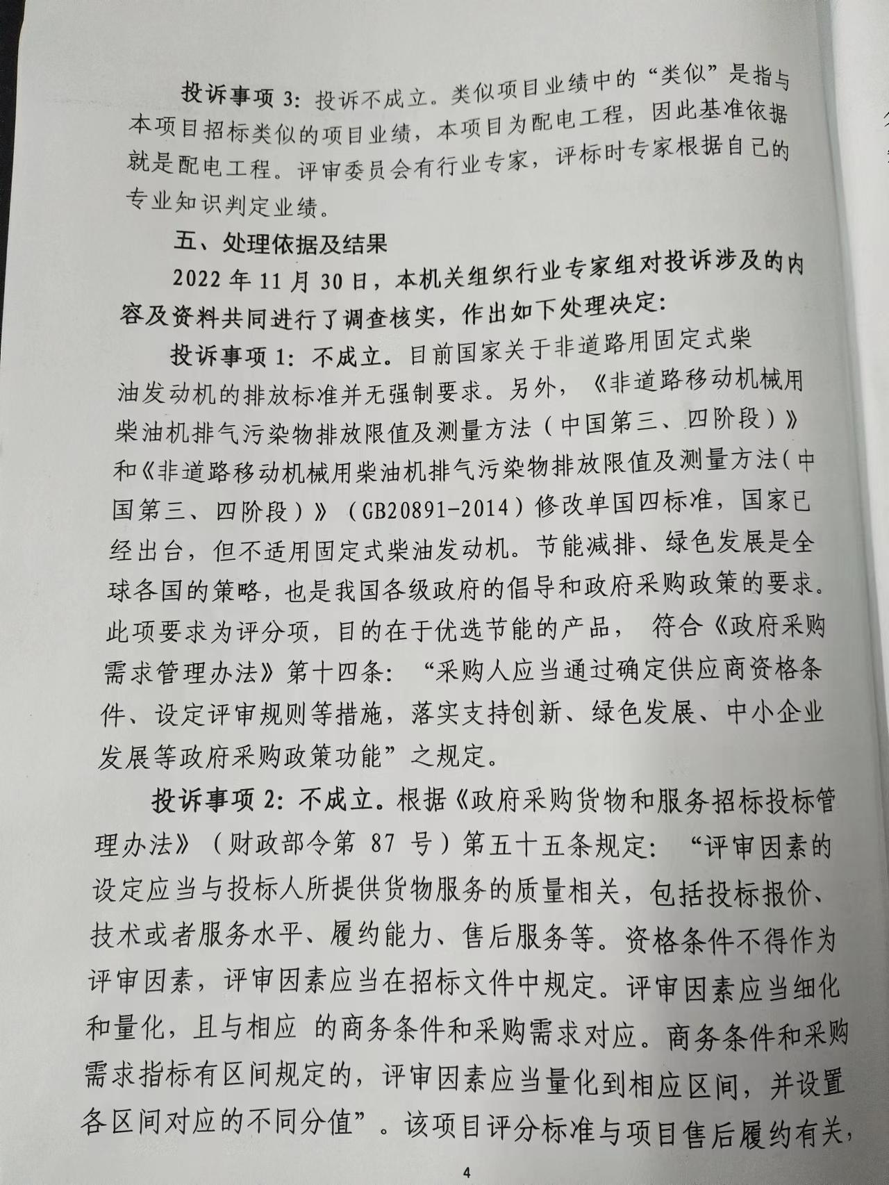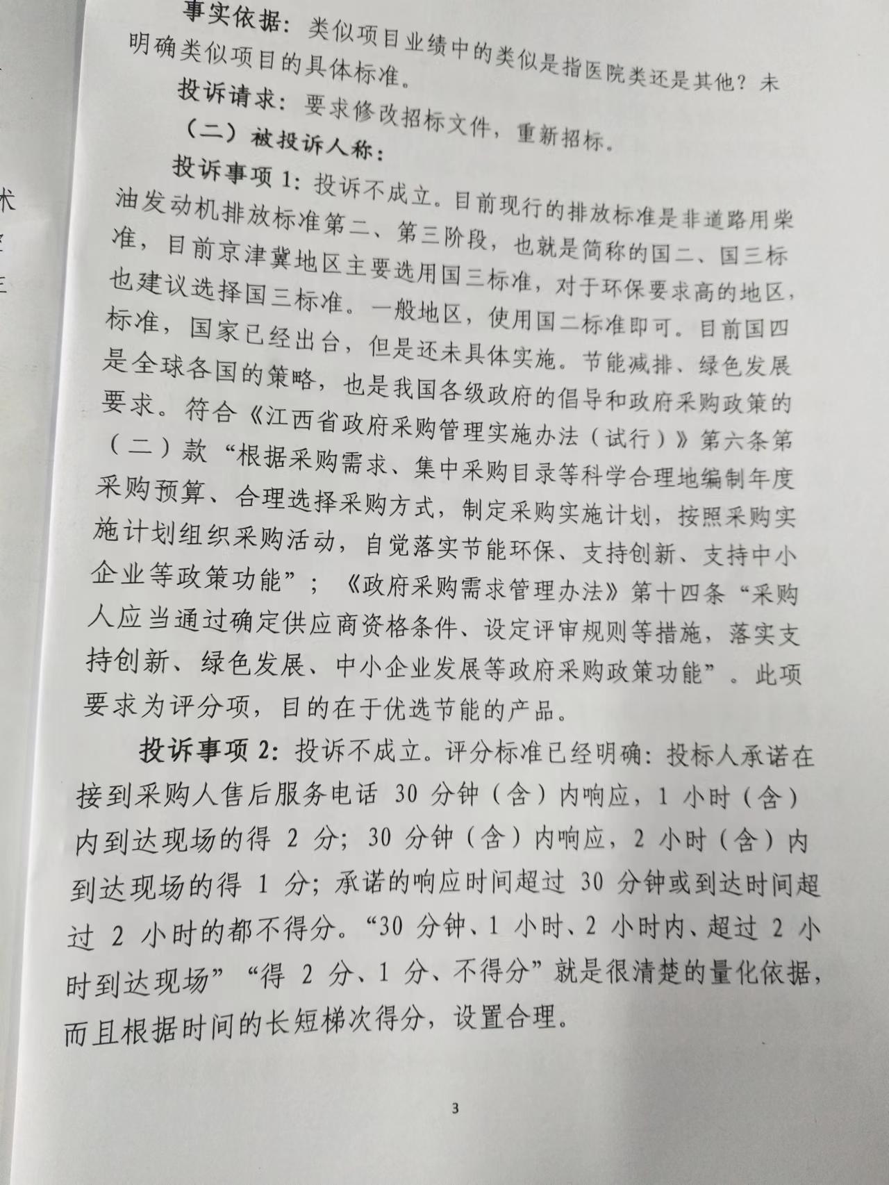 投诉事项1:投诉不成立。目前现行的排放标准是非道路用柴油发动机排放标准第二、第三阶段,也就是简称的国二、国三标准,目前京津冀地区主要选用国三标准,对于环保要求高的地区,也建议选择国三标准。一般地区,使用国二标准即可。目前国四标准,国家已经出台,但是还未具体实施。节能减排、绿色发展是全球各国的策略,也是我国各级政府的倡导和政府采购政策的要求。符合《江西省政府采购管理实施办法(试行)》第六条第(二)款“根据采购需求、集中采购目录等科学合理地编制年度采购预算、合理选择采购方式,制定采购实施计划,按照采购实施计划组织采购活动,自觉落实节能环保、支持创新、支持中小企业等政策功能”;《政府采购需求管理办法》第十四条“采购人应当通过确定供应商资格条件、设定评审规则等措施,落实支持创新、绿色发展、中小企业发展等政府采购政策功能”。此项要求为评分项,目的在于优选节能的产品。