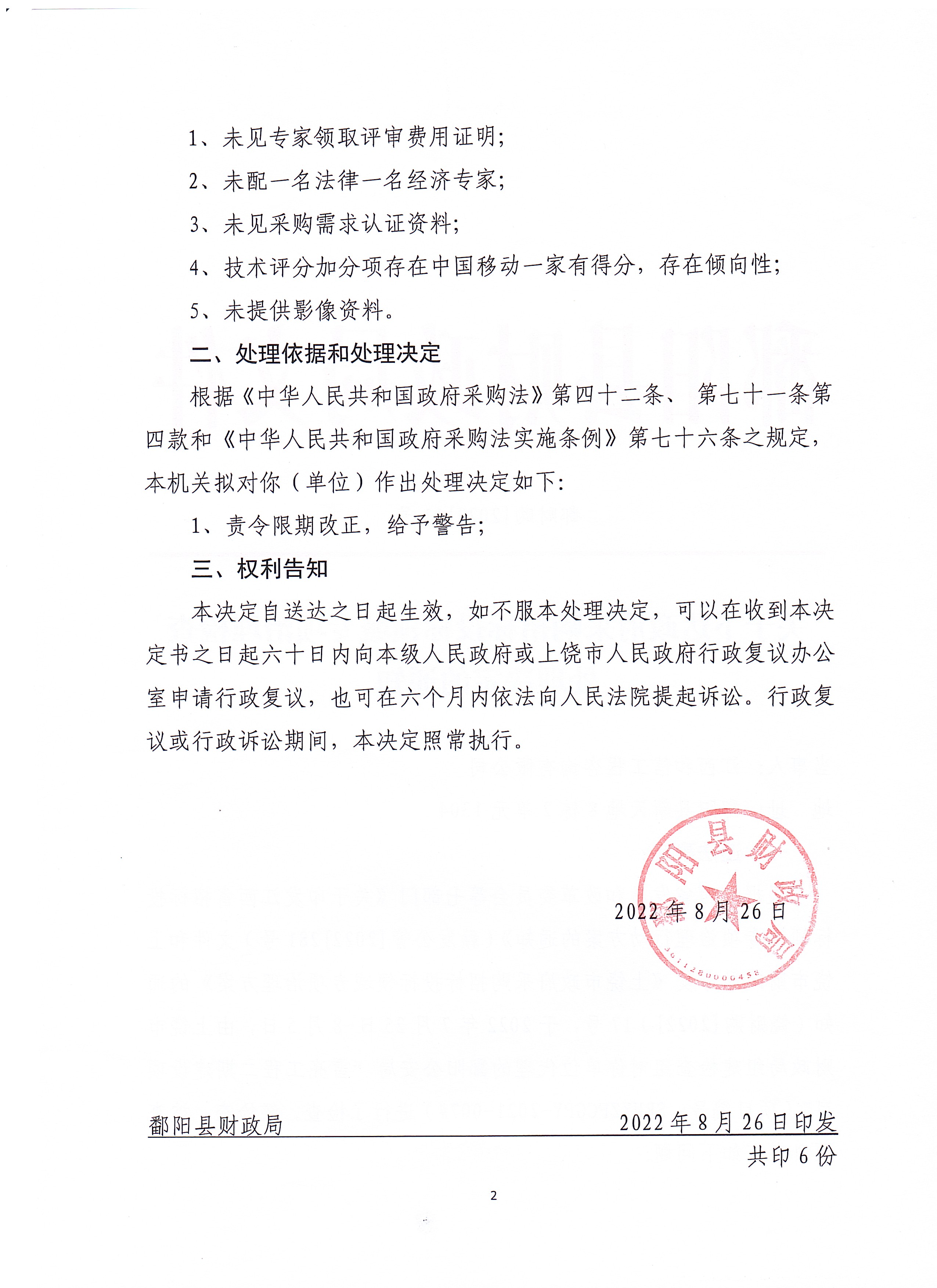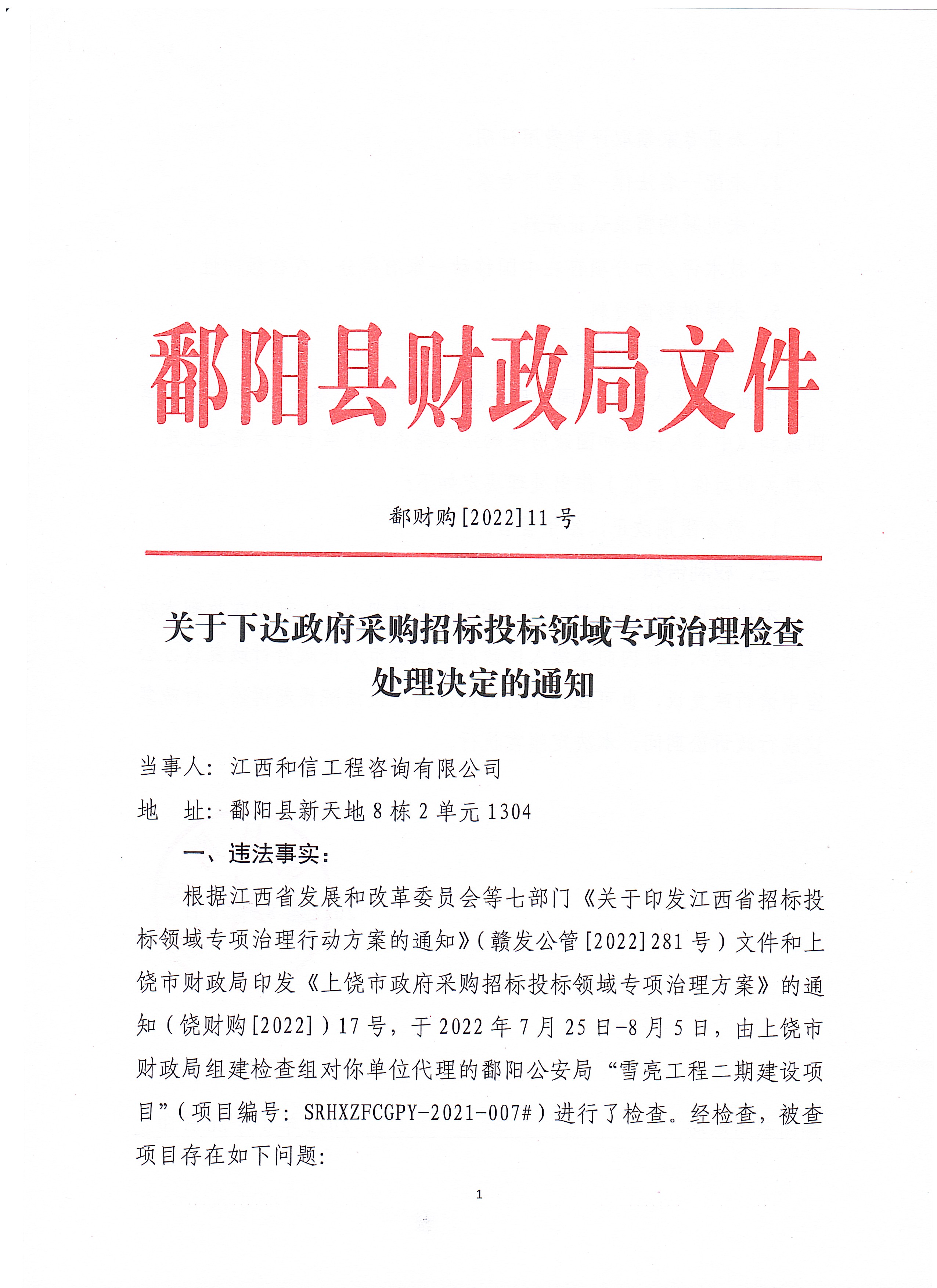 鄱阳县政府采购招标投标领域专项治理检查处理决定 鄱财购2022 11号