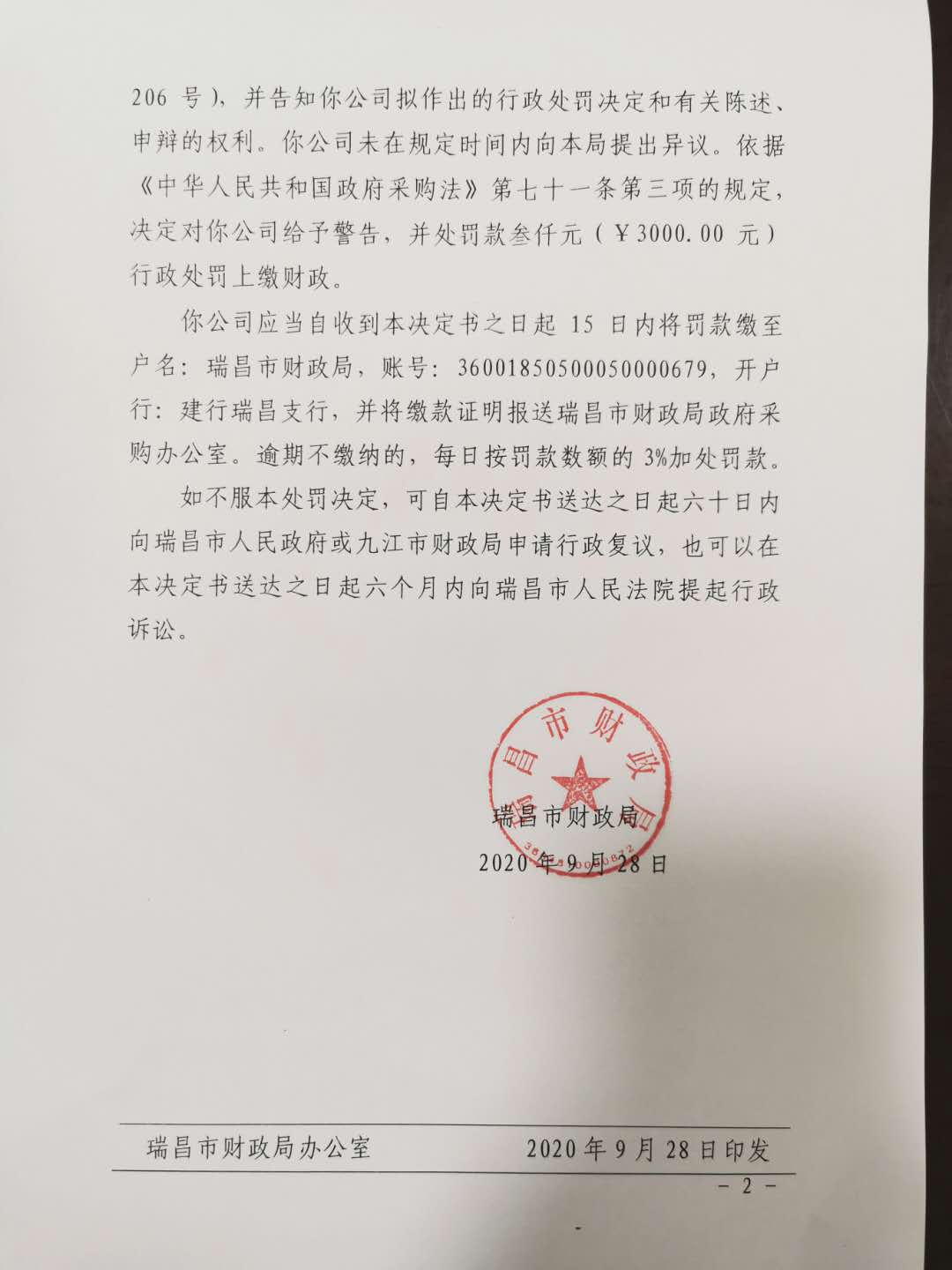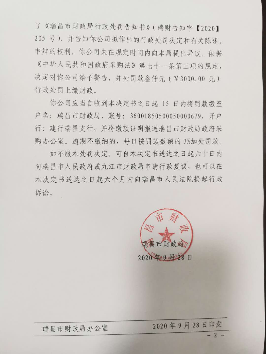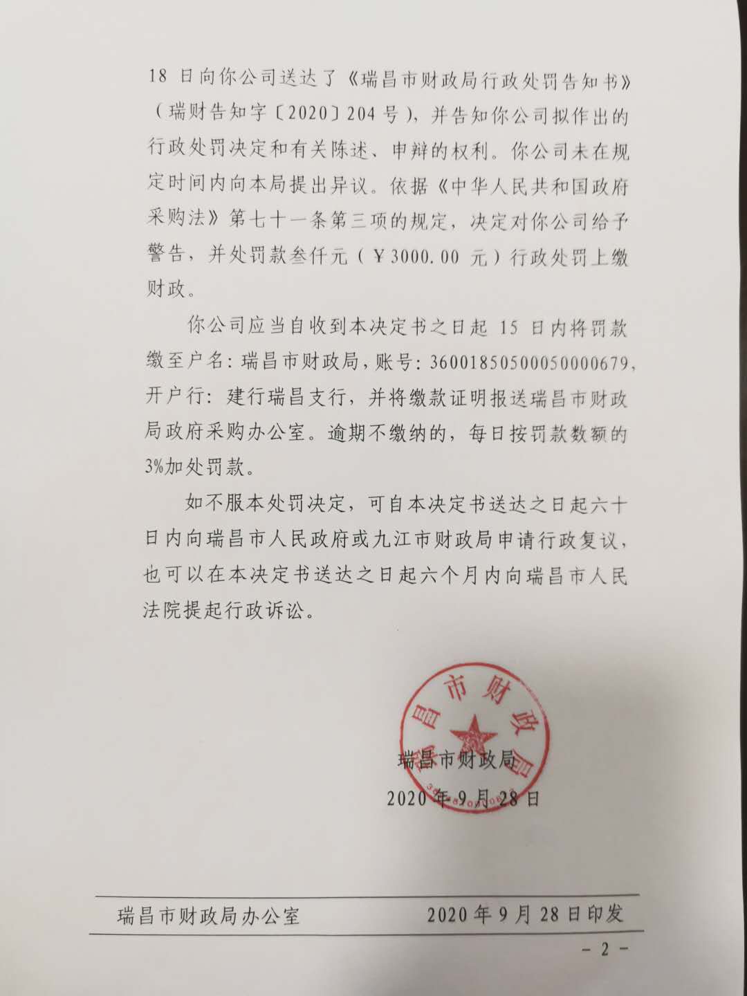瑞昌市财政局行政处罚决定书 瑞财购处[2020]217号