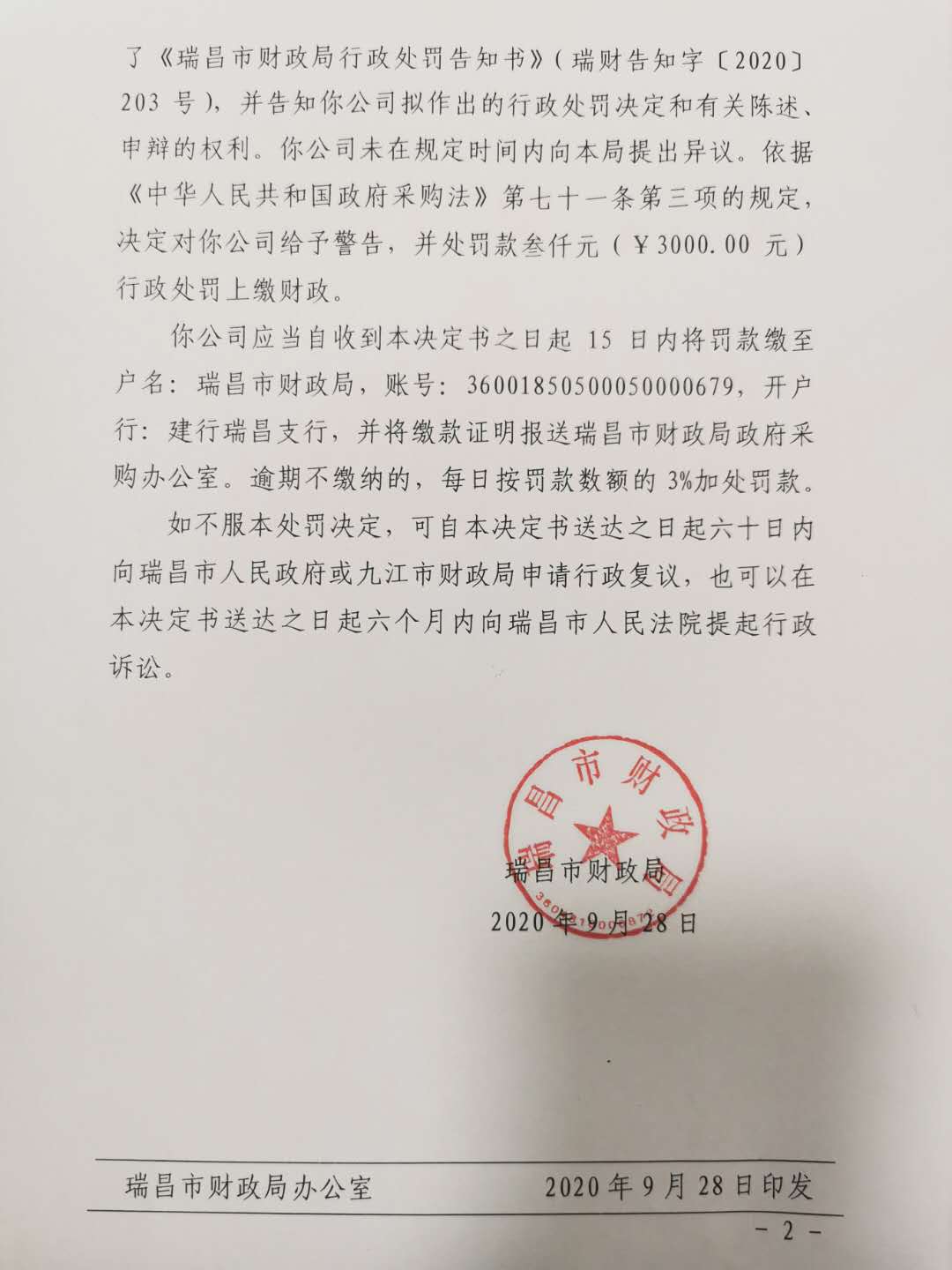 瑞昌市财政局行政处罚决定书 瑞财购处[2020]214号