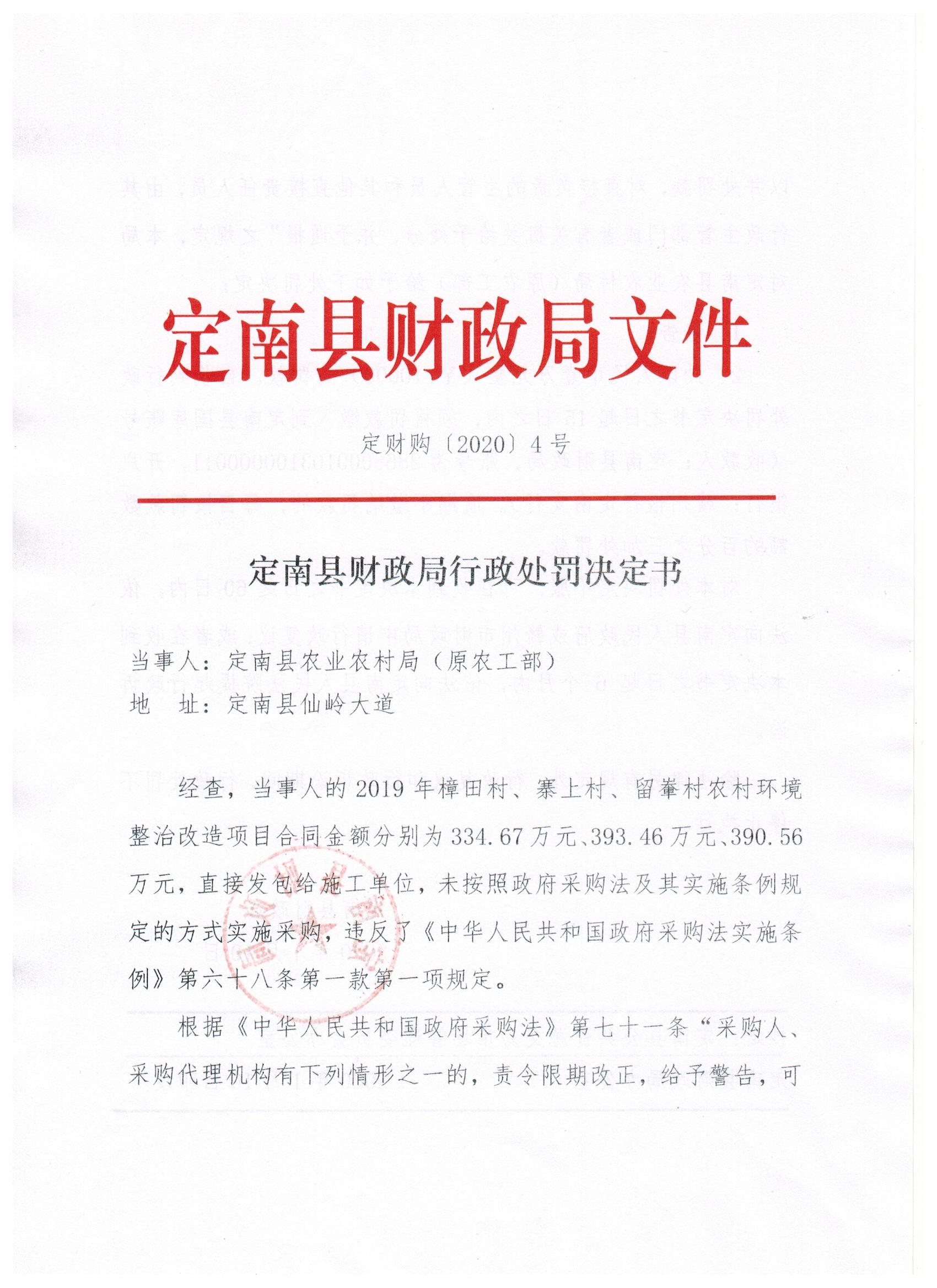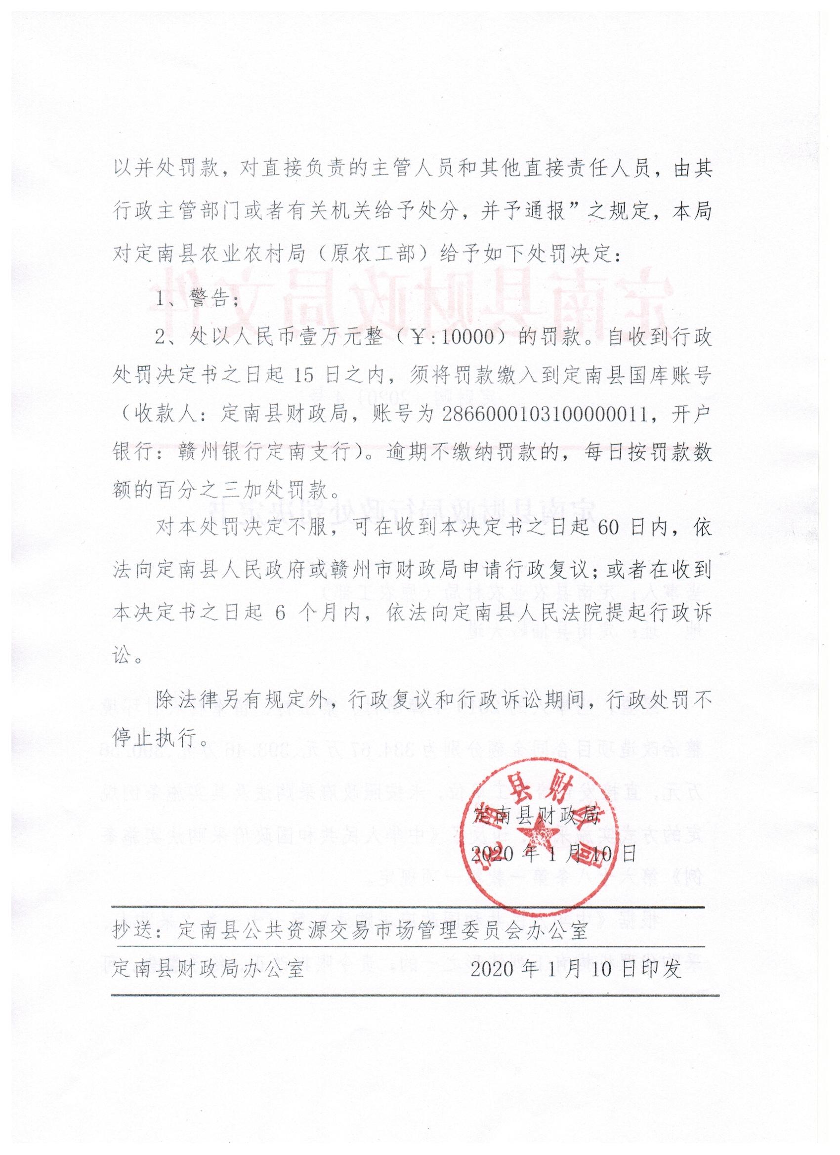 定南县财政局行政处罚决定书