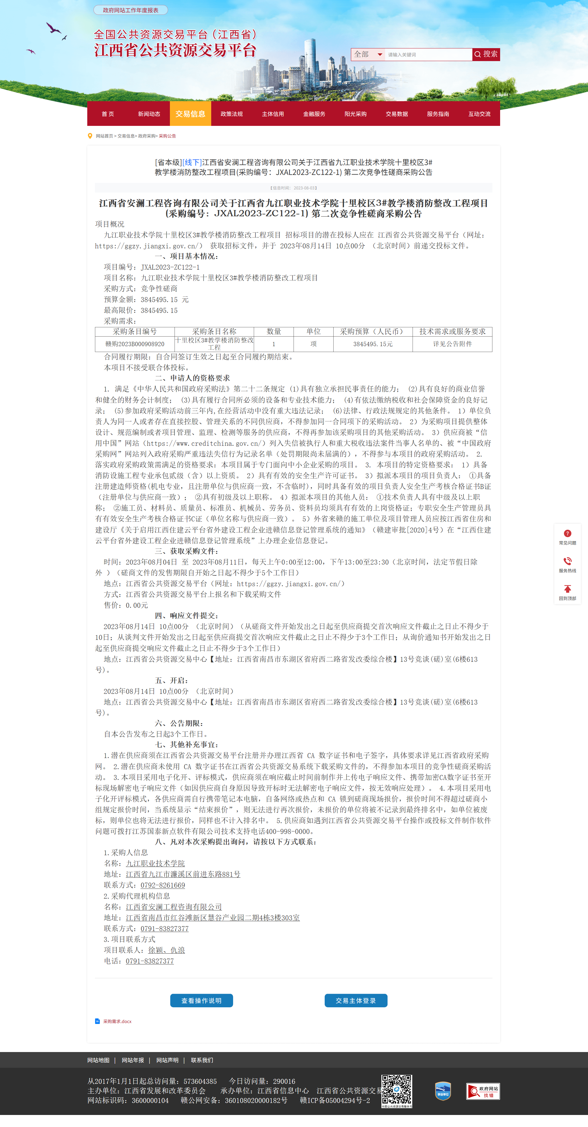 江西省安澜工程咨询有限公司关于江西省九江职业技术学院十里校区3#教学楼消防整改工程项目(采购编号:JXAL2023-ZC122-1) 第二次竞争性磋商采购公告