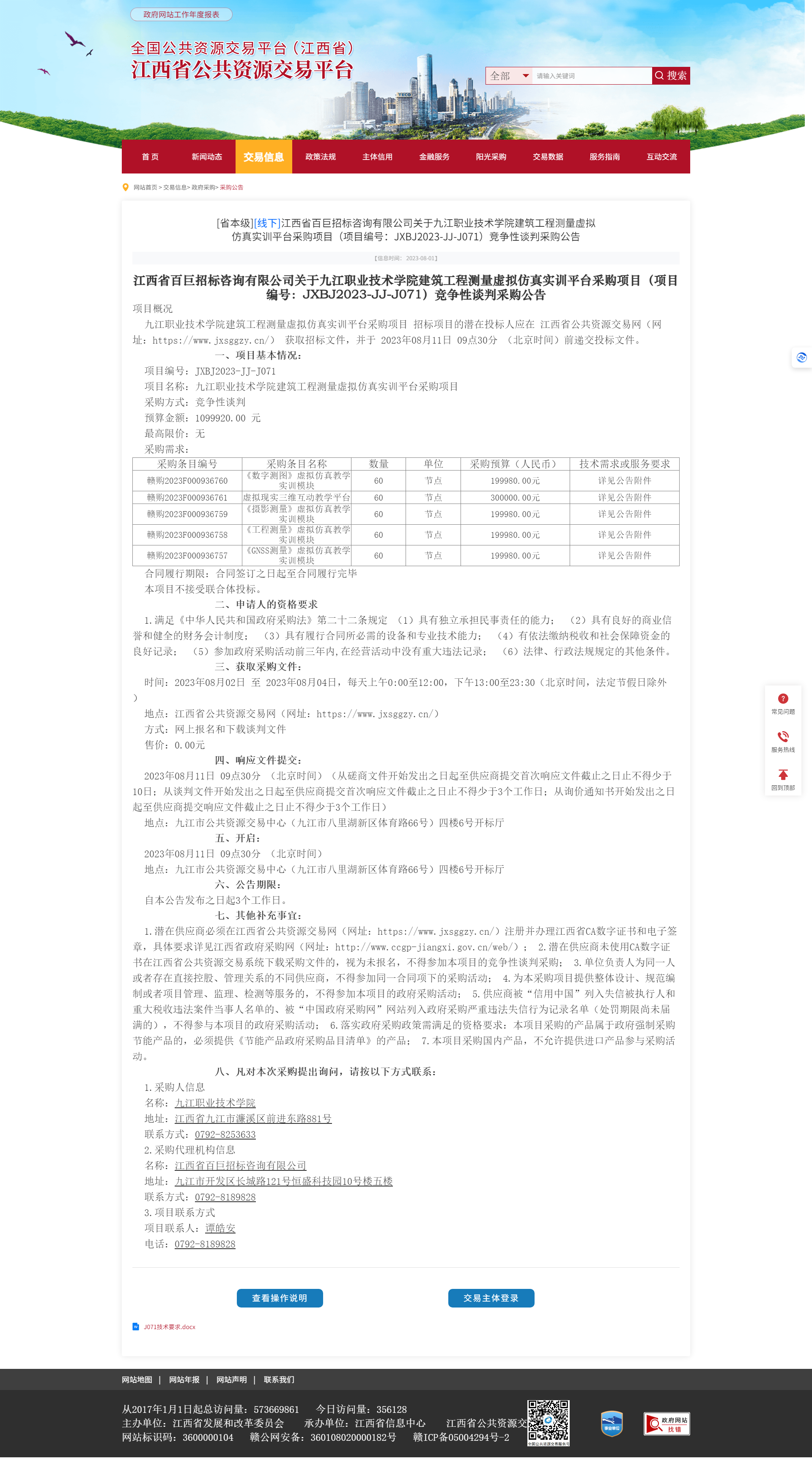| 赣购2023F000936757 | 《GNSS测量》虚拟仿真教学实训模块 | 60 | 节点 | 199980.00元 | 详见公告附件 |