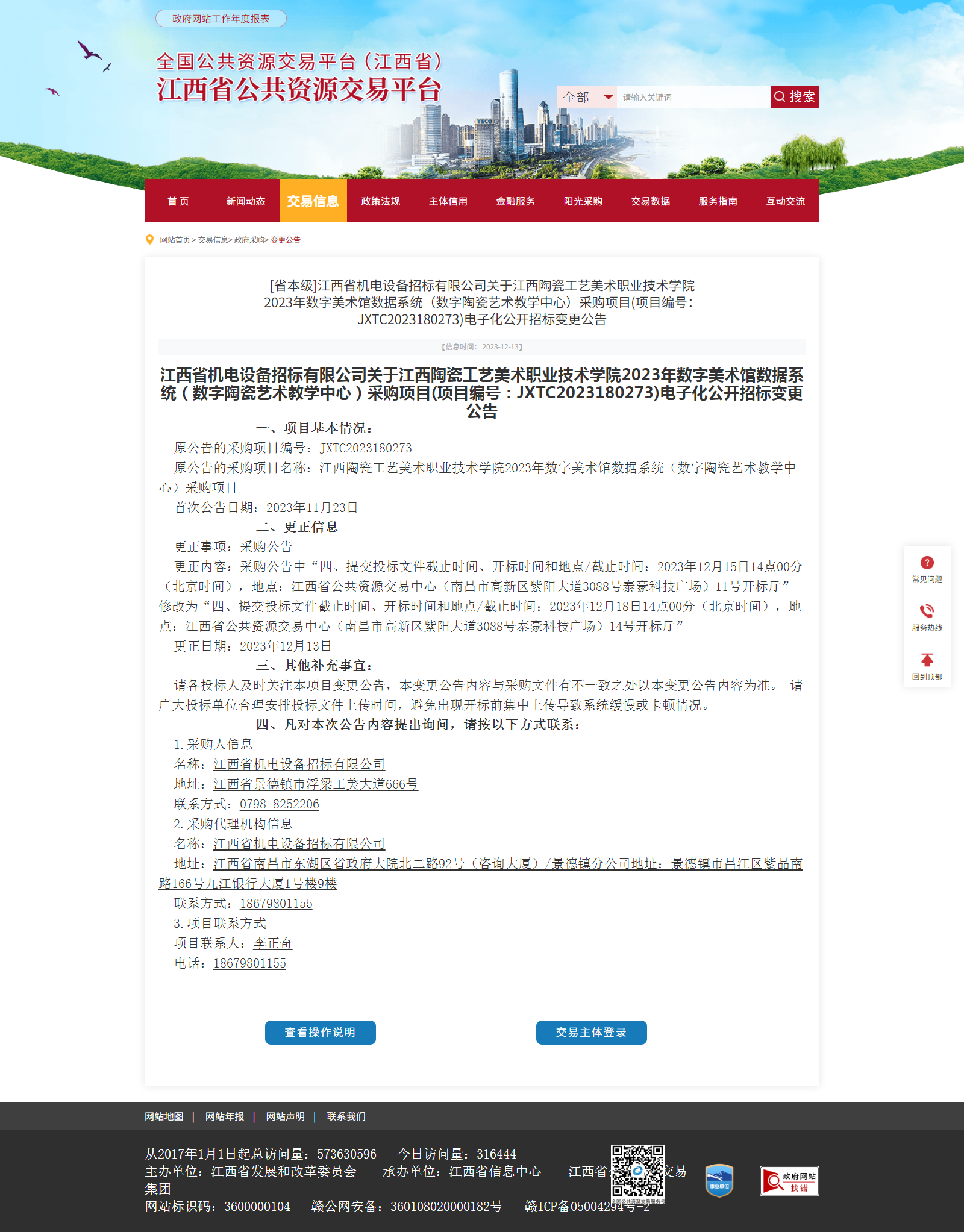 江西省机电设备招标有限公司关于江西陶瓷工艺美术职业技术学院2023年数字美术馆数据系统(数字陶瓷艺术教学中心)采购项目(项目编号:JXTC2023180273)电子化公开招标变更公告
